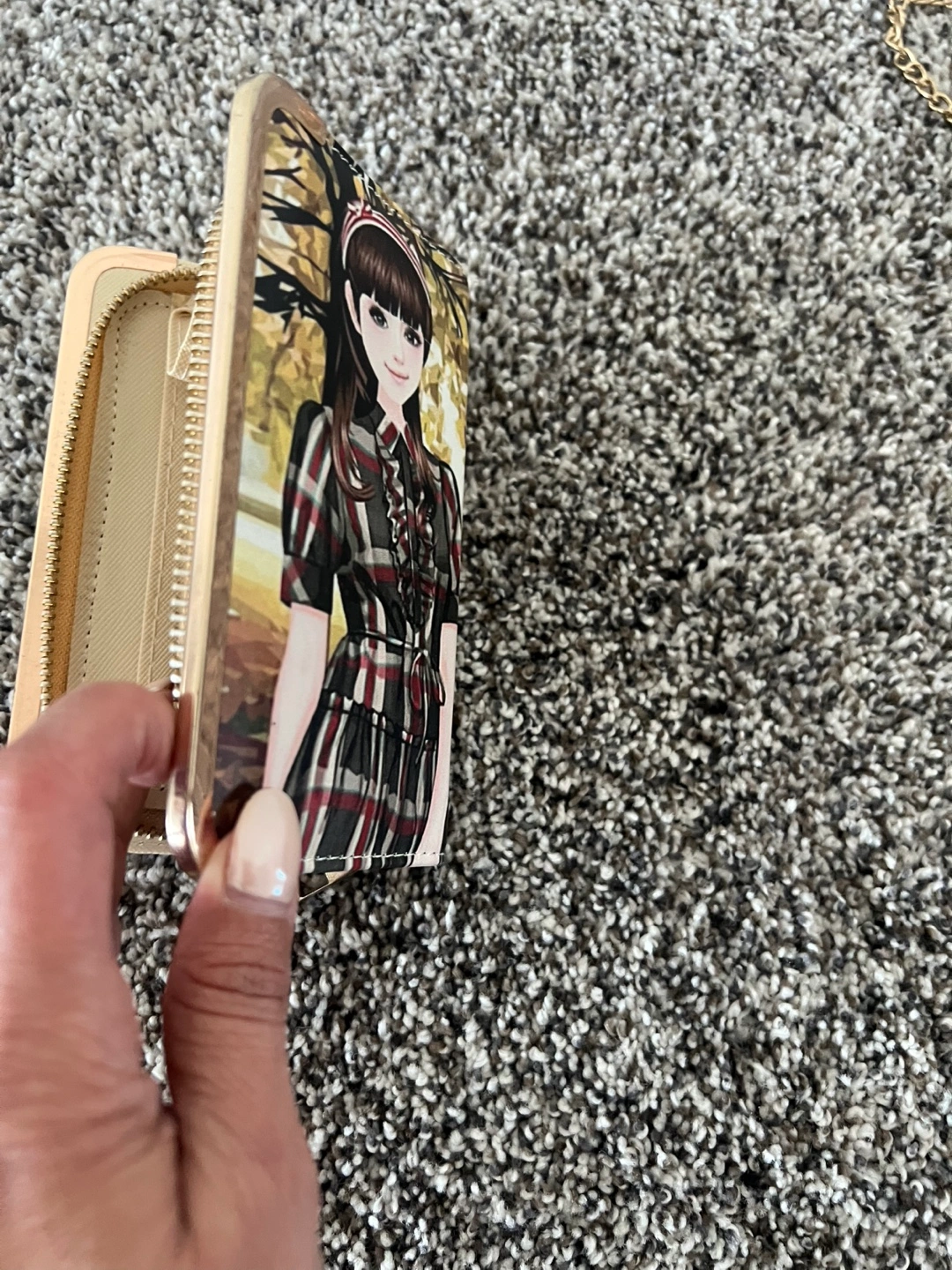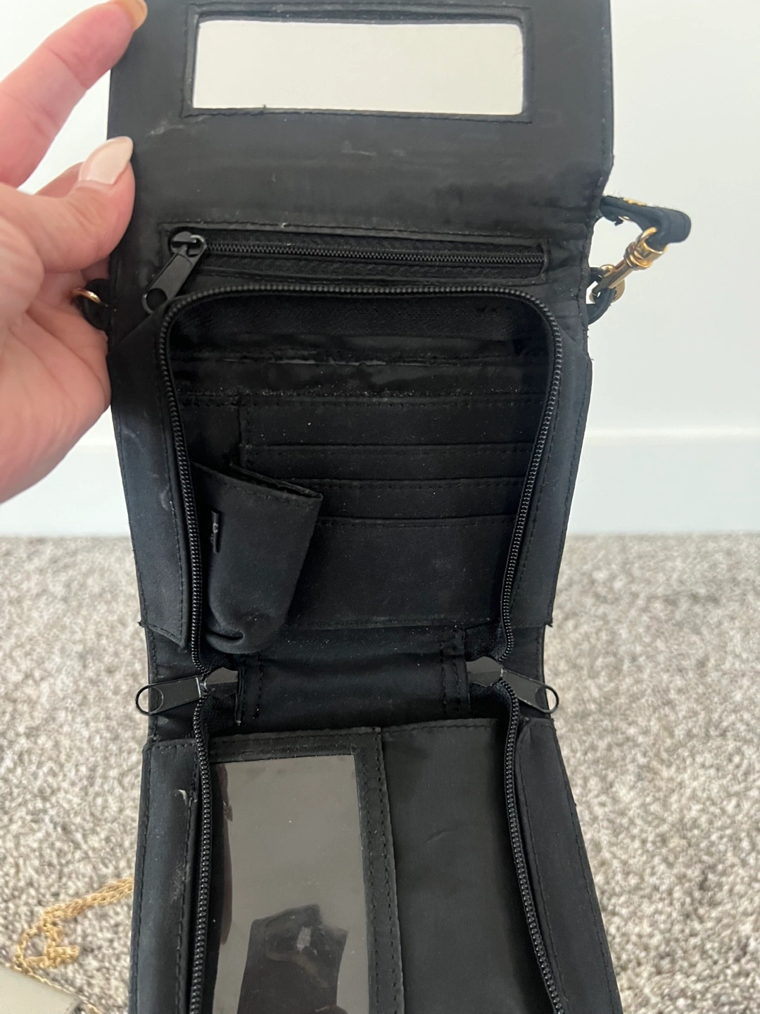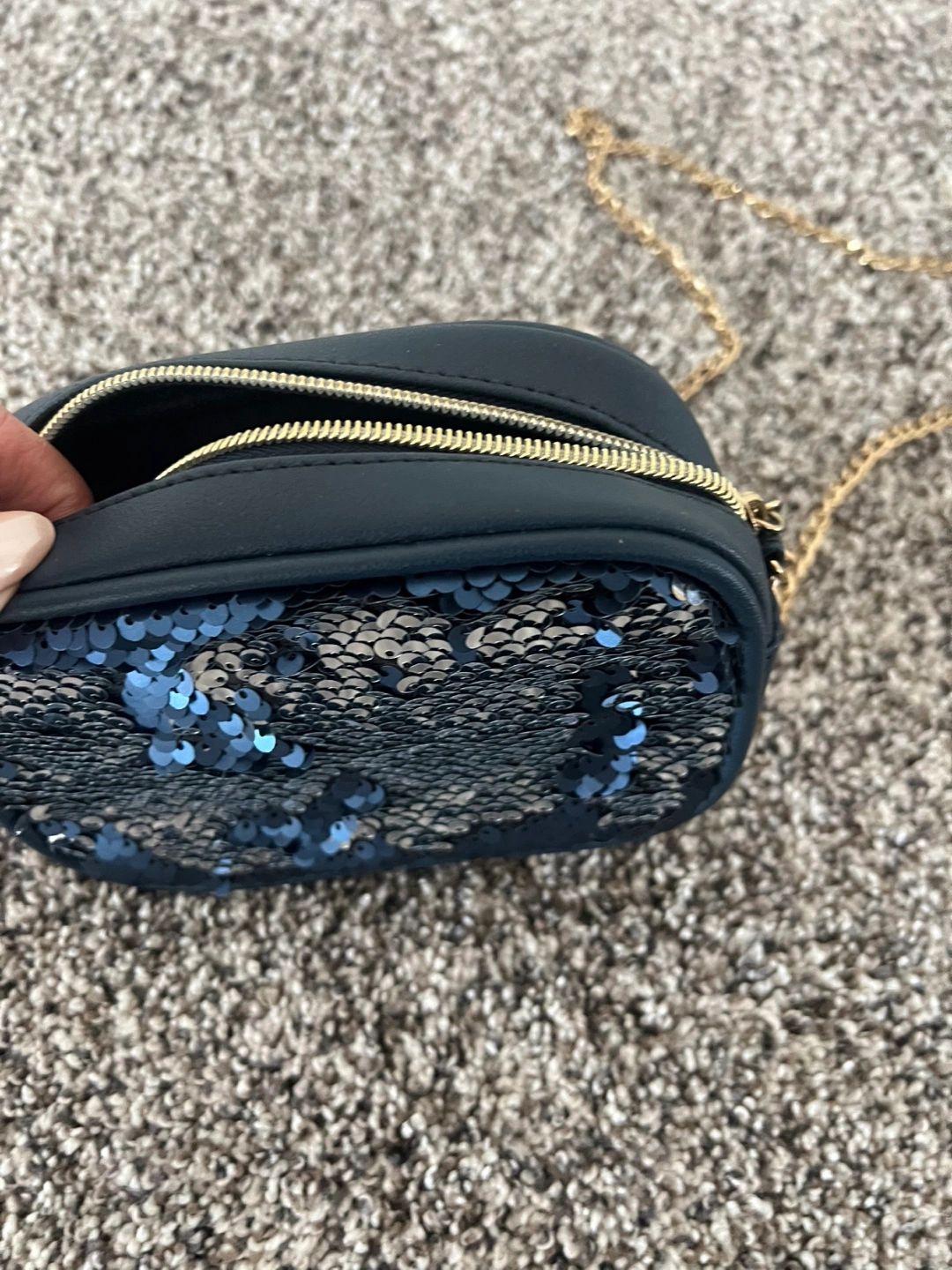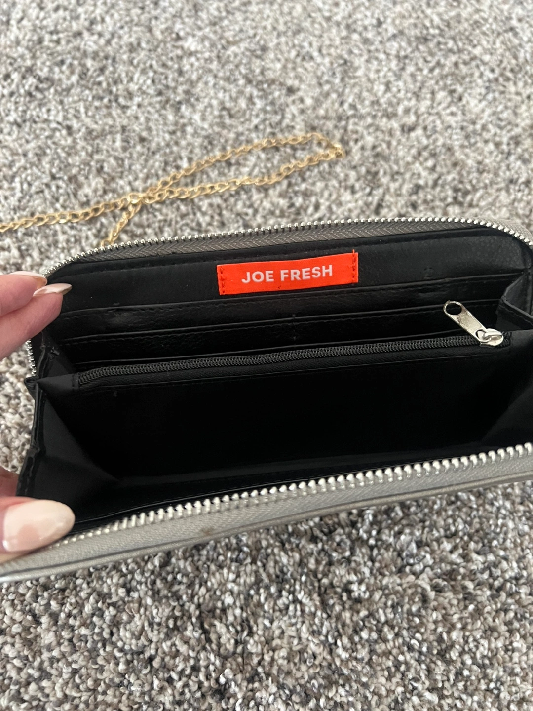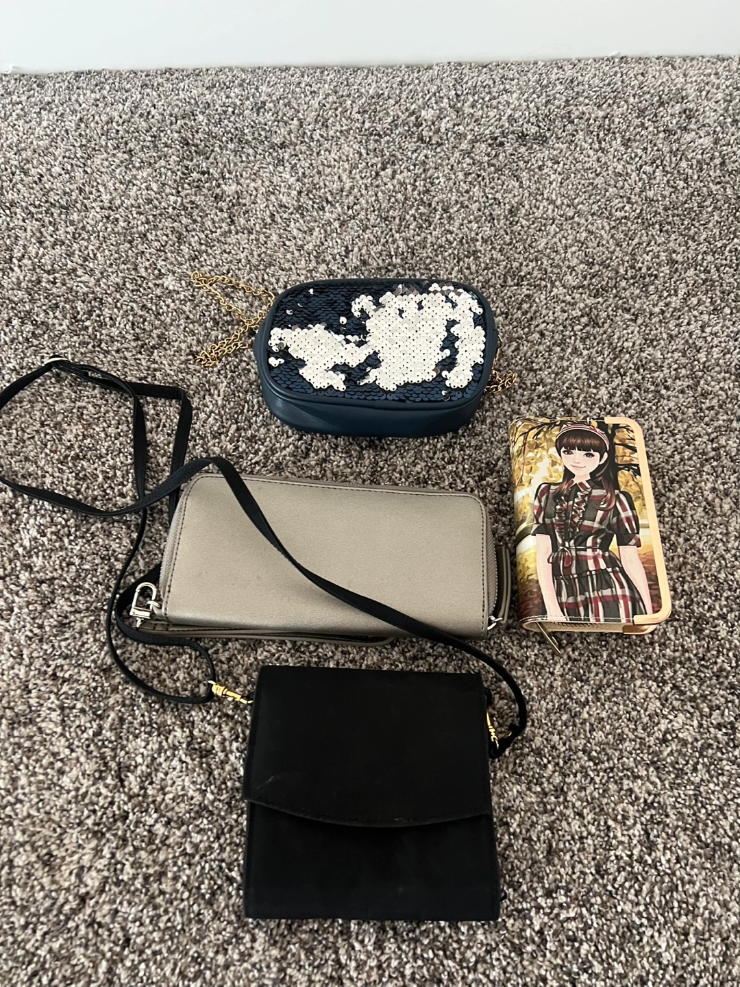 Selling a Joe Fresh wallet in silver. A brand new girl picture wallet. 2 side bags, one with navy blue and silver sequins and a chain to carry and the other black side bag has a mini mirror in it and a strap to carry. All for a great price.