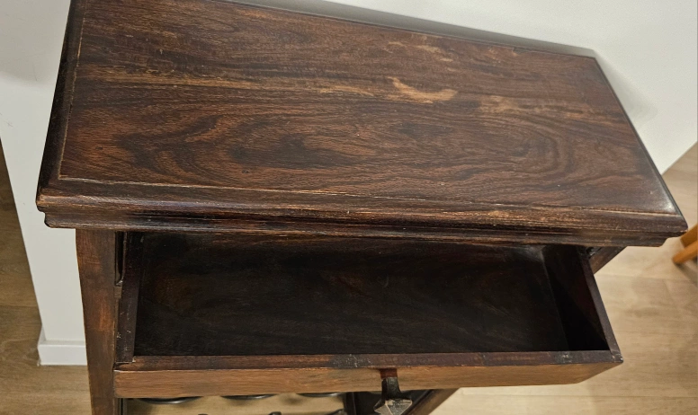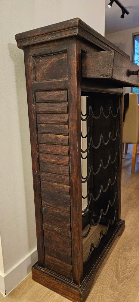 Selling a wooden wine rack with a drawer on top. It has a dark wood finish and can hold several bottles of wine. Dimensions are approximately 99cm tall, 57cm wide, and 25cm deep. Perfect for storing your wine collection!