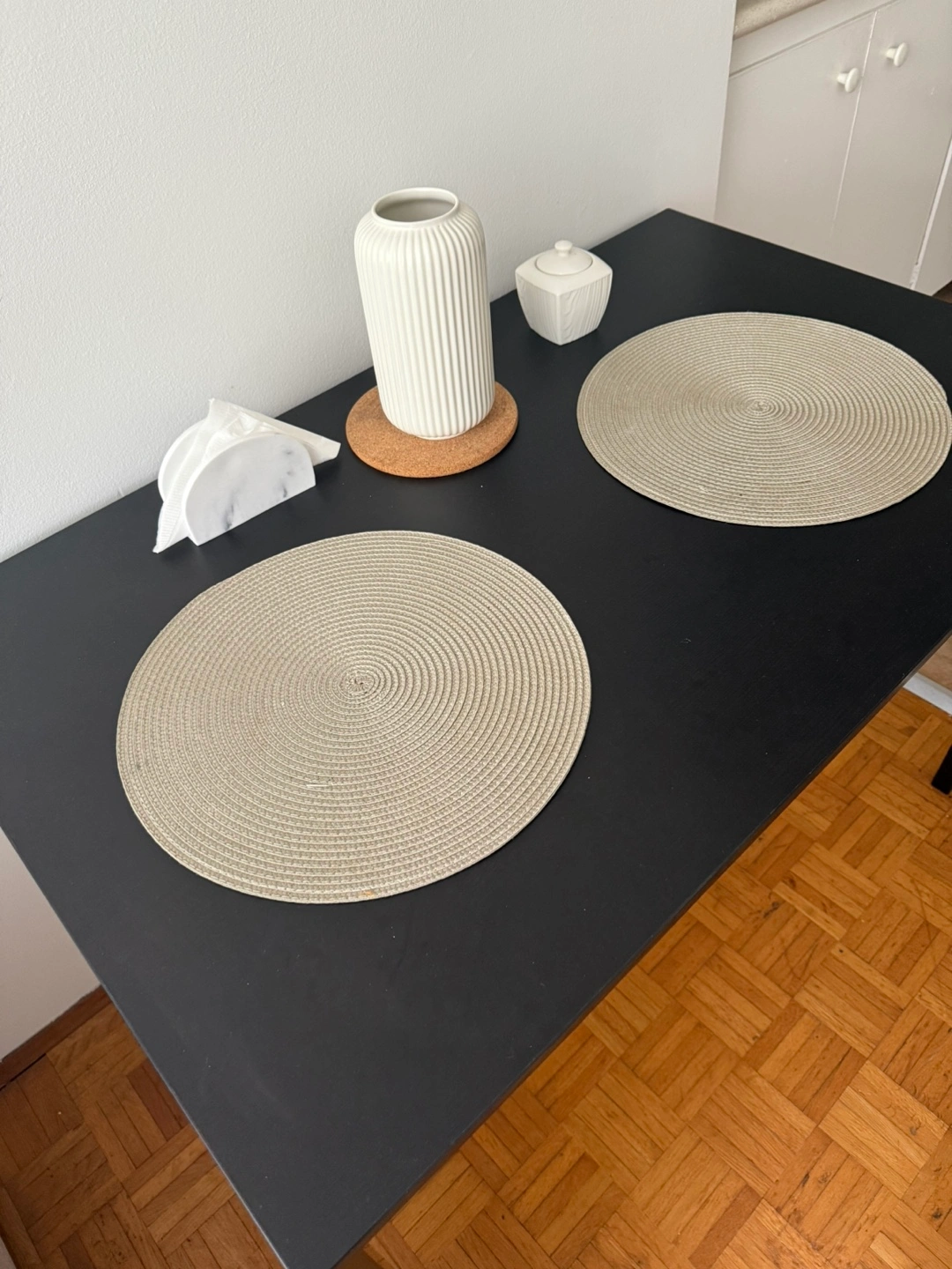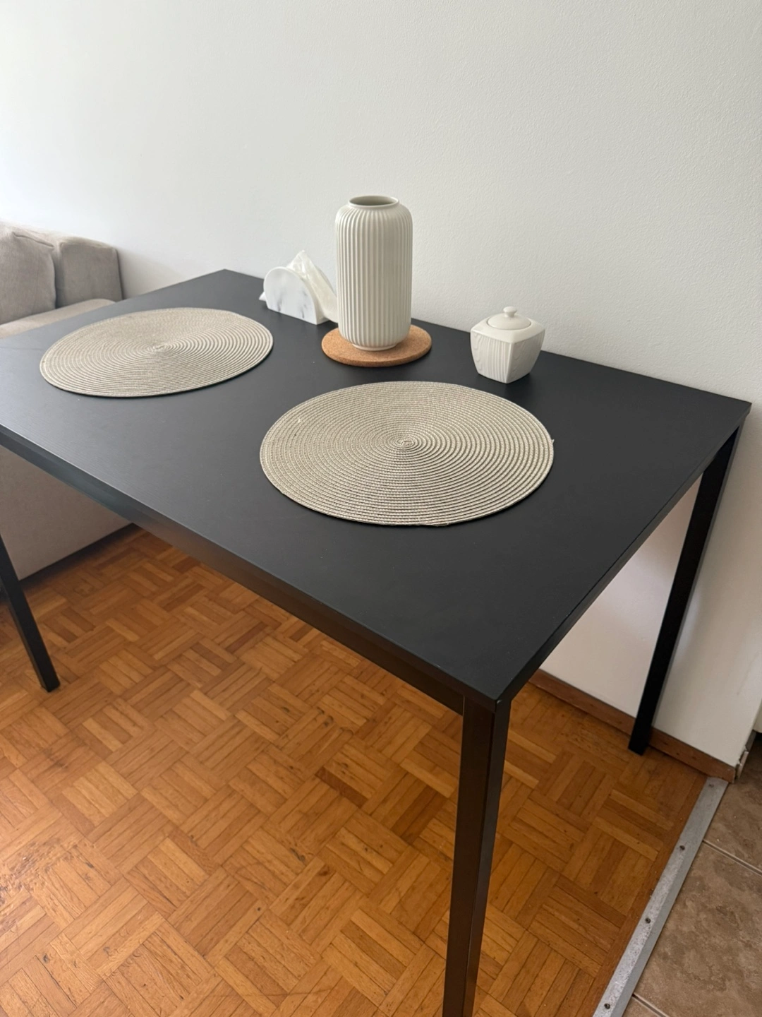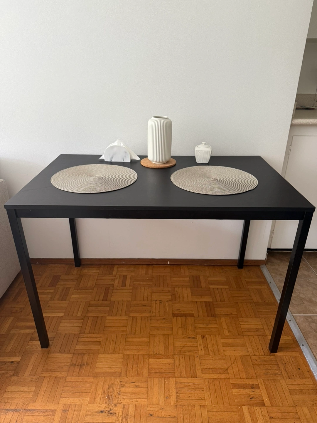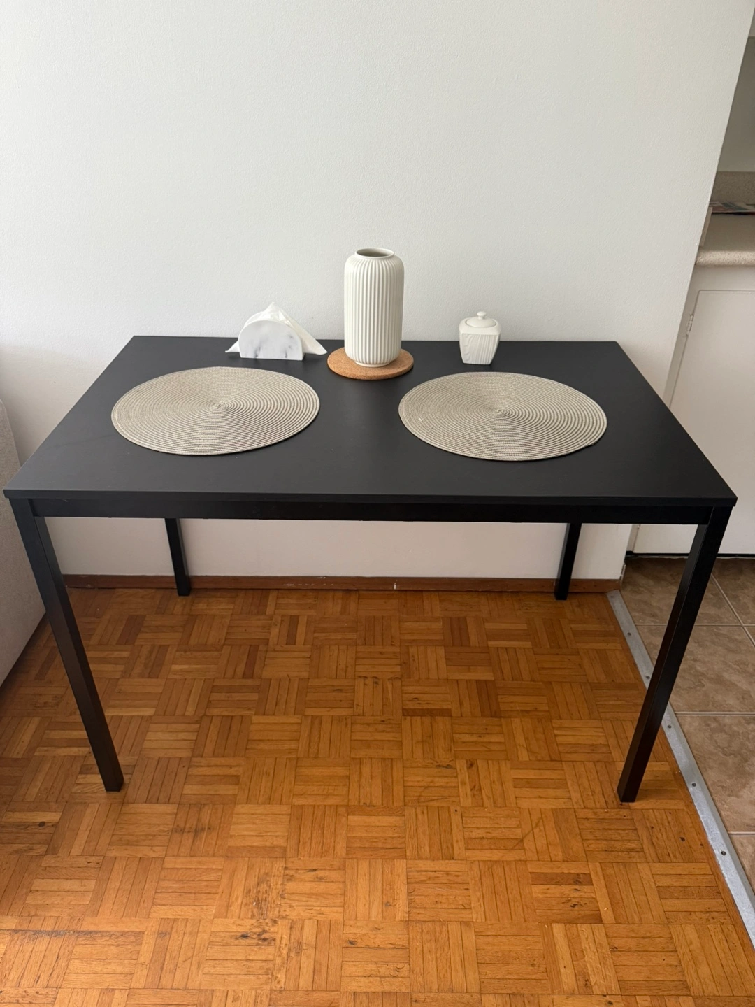 Selling a simple black table. It comes with two round placemats as pictured. Perfect for a small dining area or kitchen!