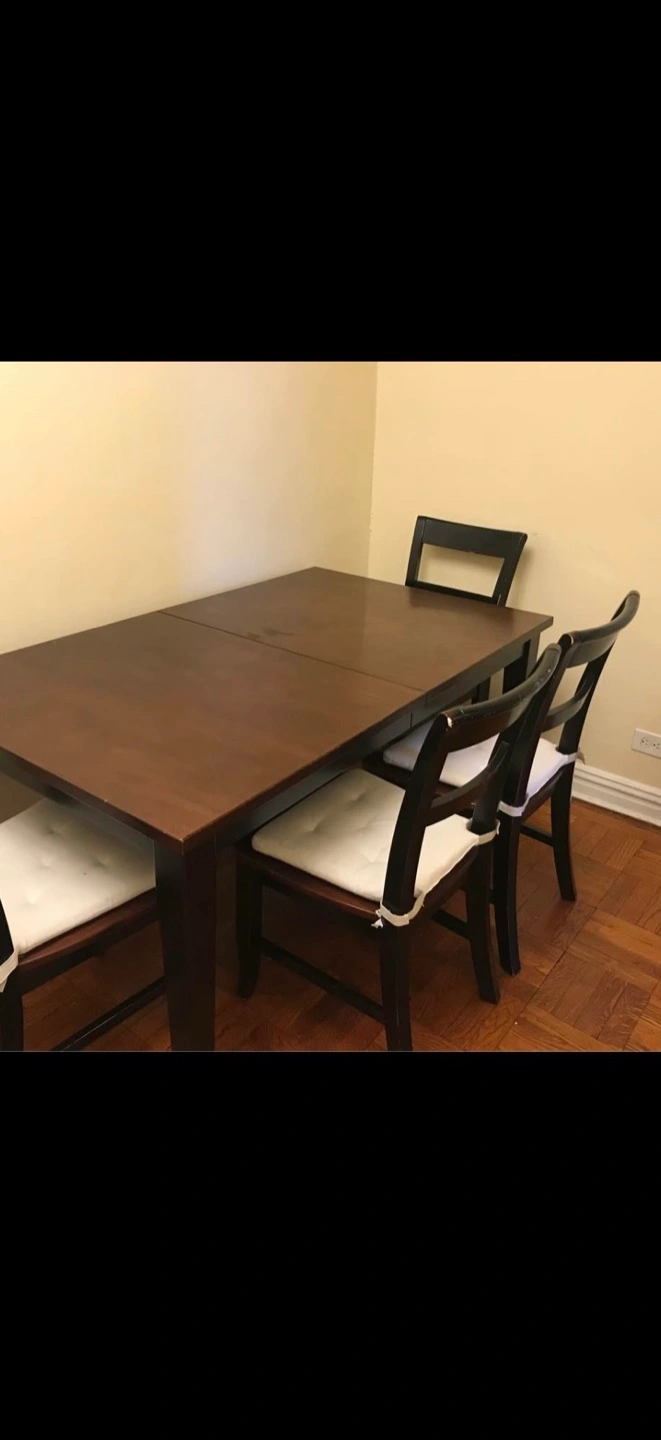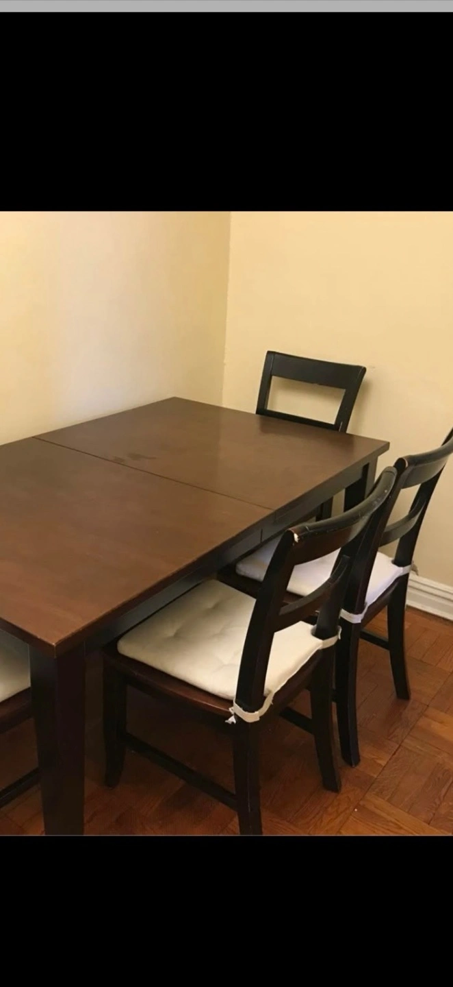 Selling a dining table with four chairs. The table is a dark wood color, and the chairs have white cushions. It's in good condition and ready for a new home!