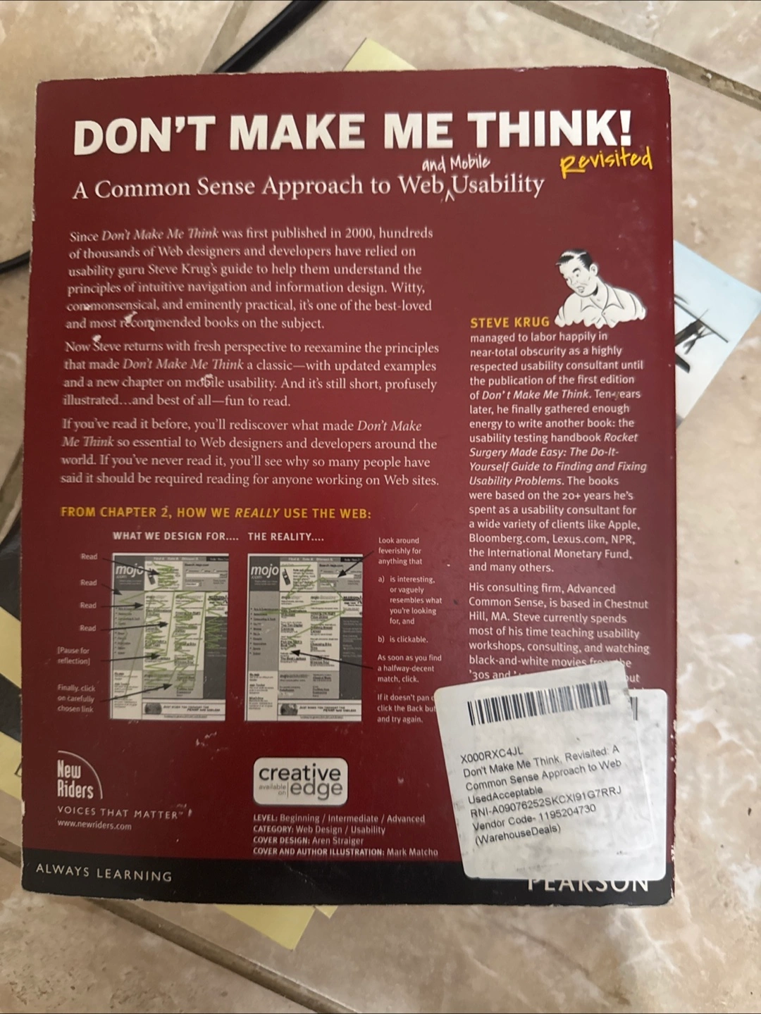 Buy & SellDon't Make Me Think! by Steve KrugDon't Make Me Think! by Steve Krug$6Selling the book 'Don't Make Me Think! A Common Sense Approach to Web Usability' by Steve Krug. It's a great resource for anyone working on web sites and looking to improve usability!WHERE TO MEETBrighton Beach AveView MapSELLERverifiedElenaBrighton Beach761 review0 chats·0 favorites·1 viewsSEND CHAT TO SELLERHi Elena! I’m interested in your listing.Hi Elena! I’m interested in your listing.Get the Karrot app to chatSign In to chat