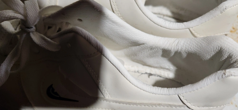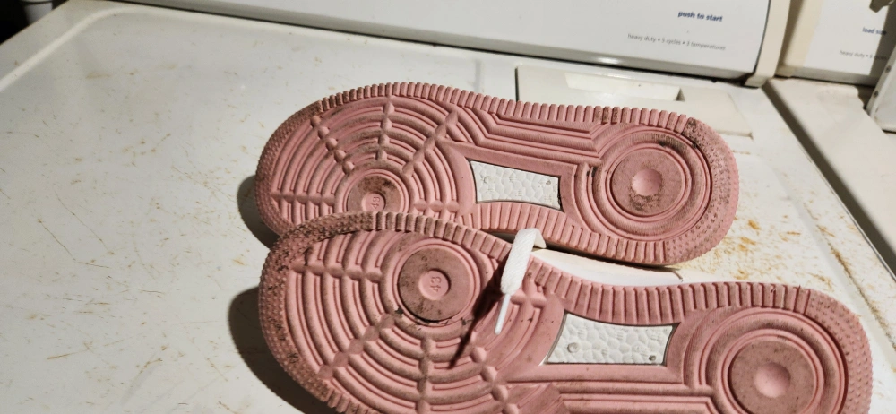 Selling a pair of Nike Air Force 1 sneakers. They are size 43 and have a white and pink colour scheme. They show signs of wear..no insoles