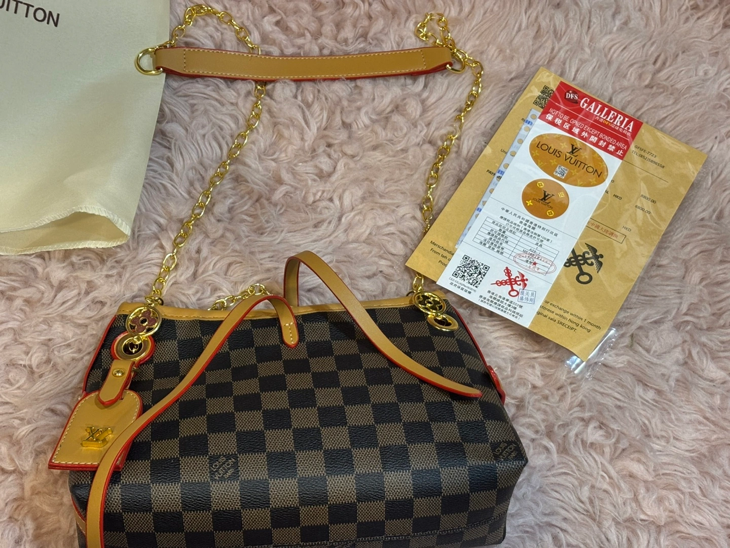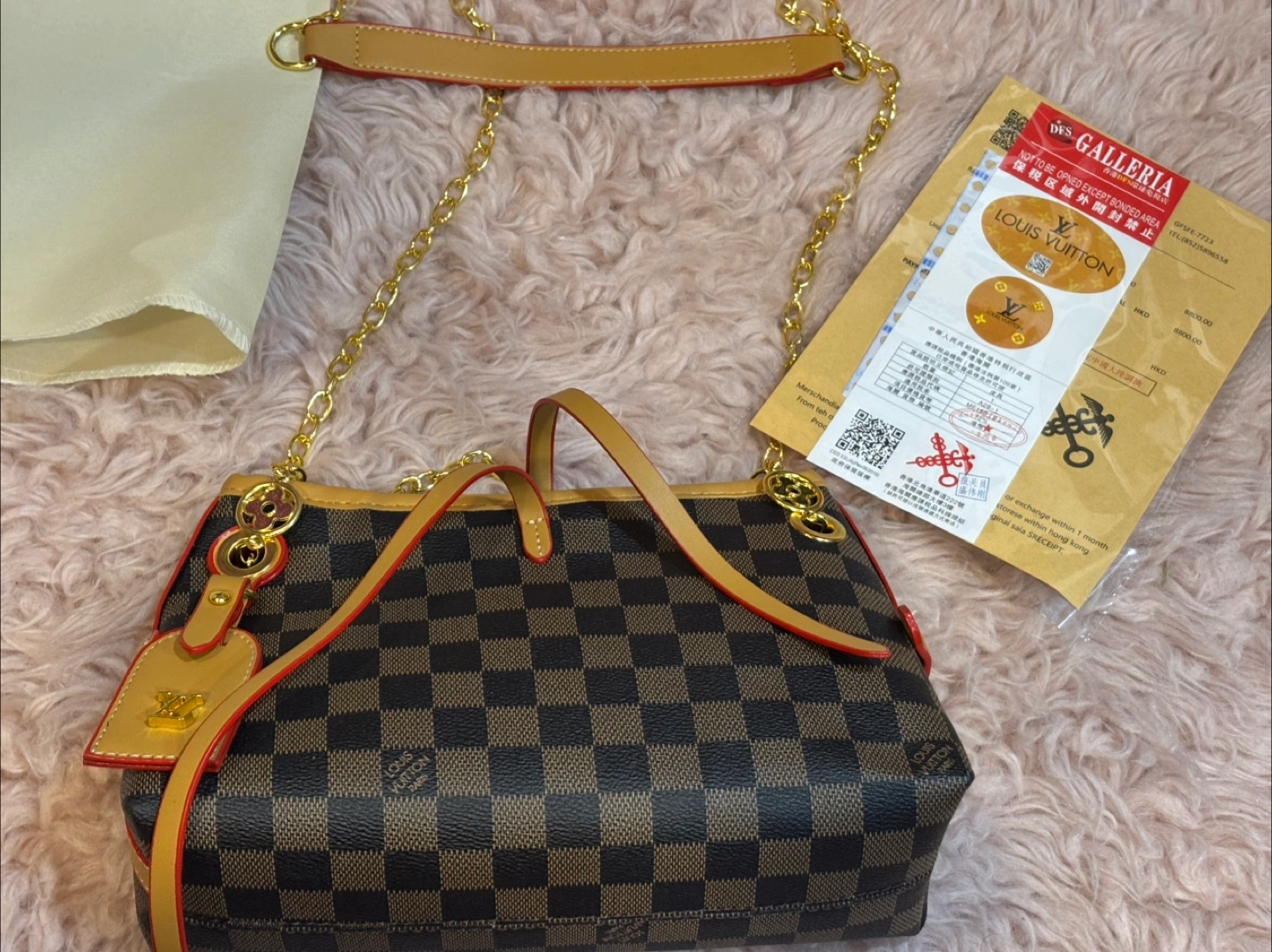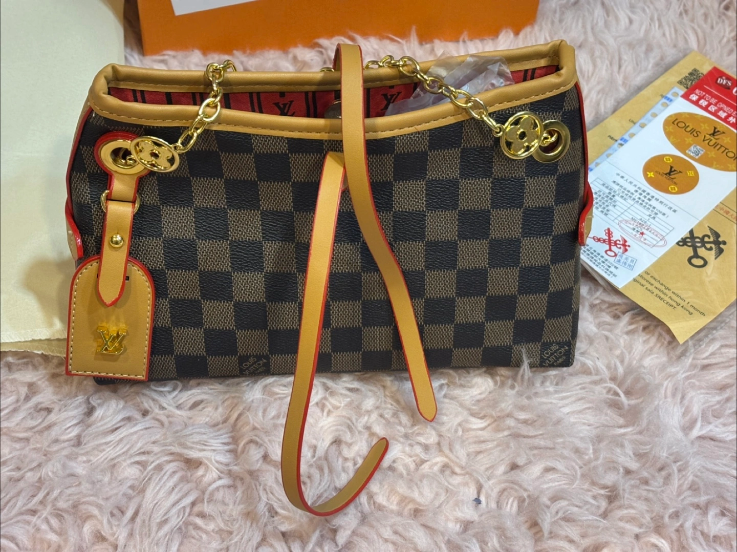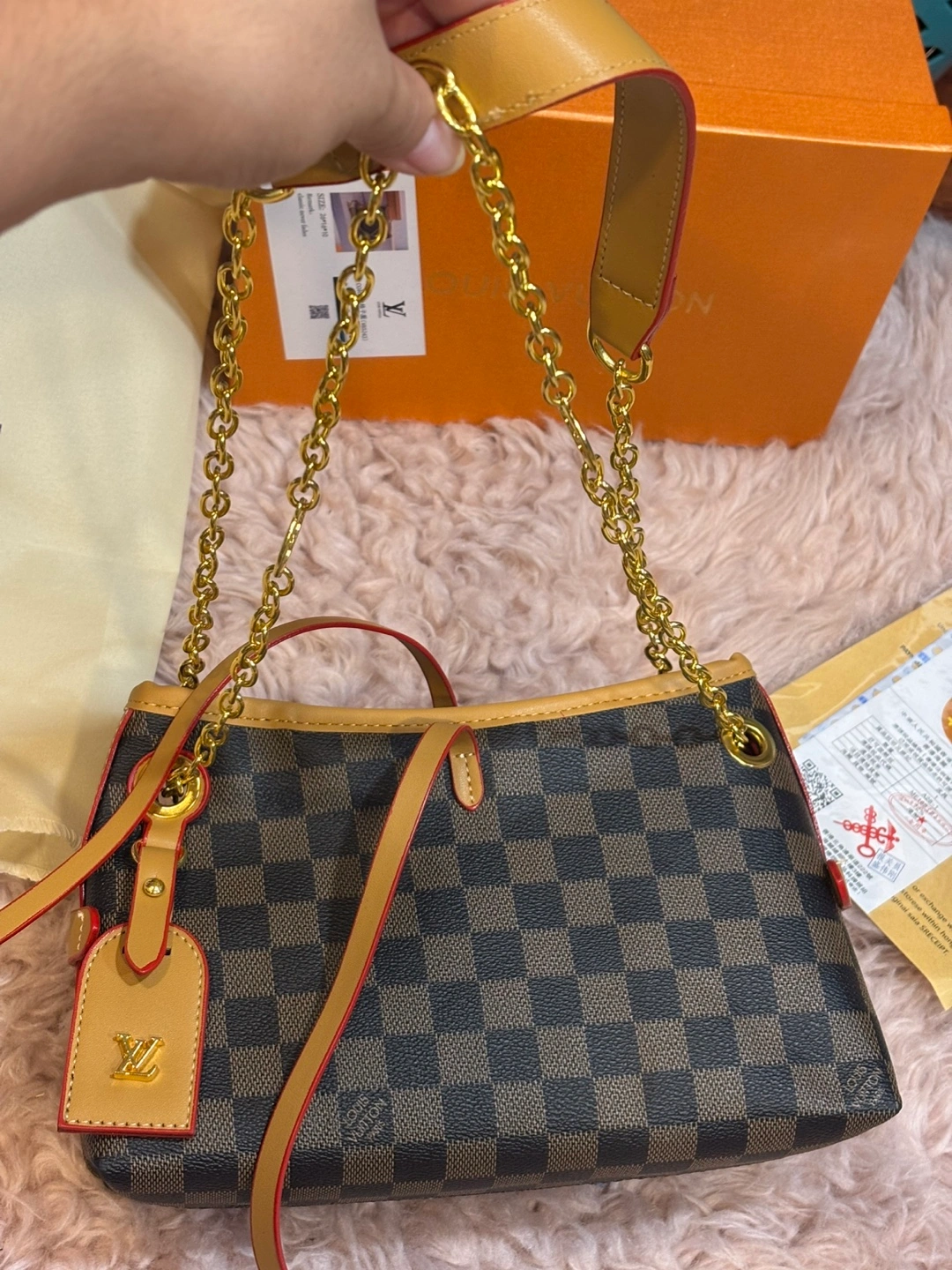 Selling a stylish Louis Vuitton Damier Ebene chain bag! It's in great condition and comes with the box and dust bag. The classic Damier Ebene pattern and gold chain add a touch of luxury to any outfit