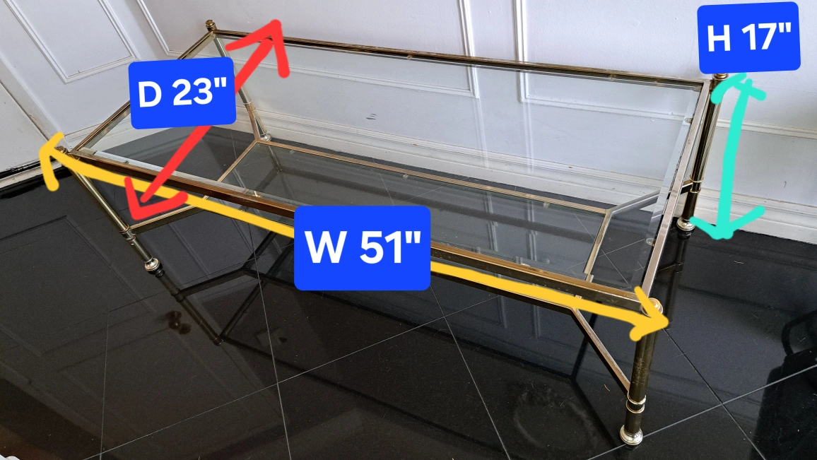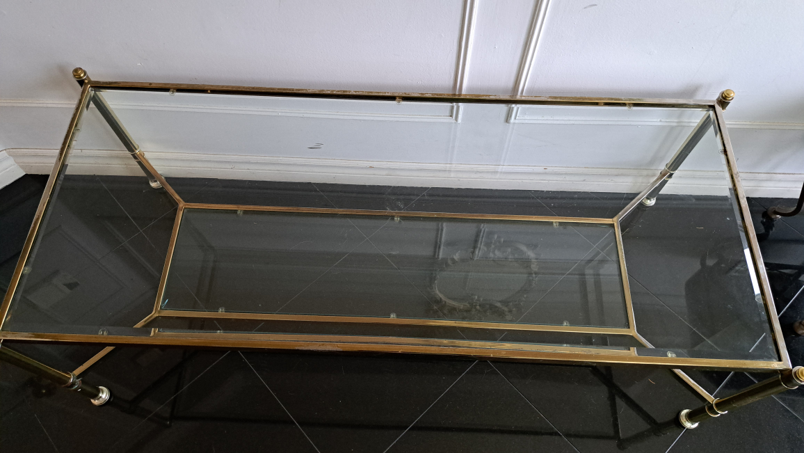 Selling a stylish coffee table with a glass top and brass-coloured frame. It measures 51 inches wide, 23 inches deep, and 17 inches high. It would be a great addition to any living room!