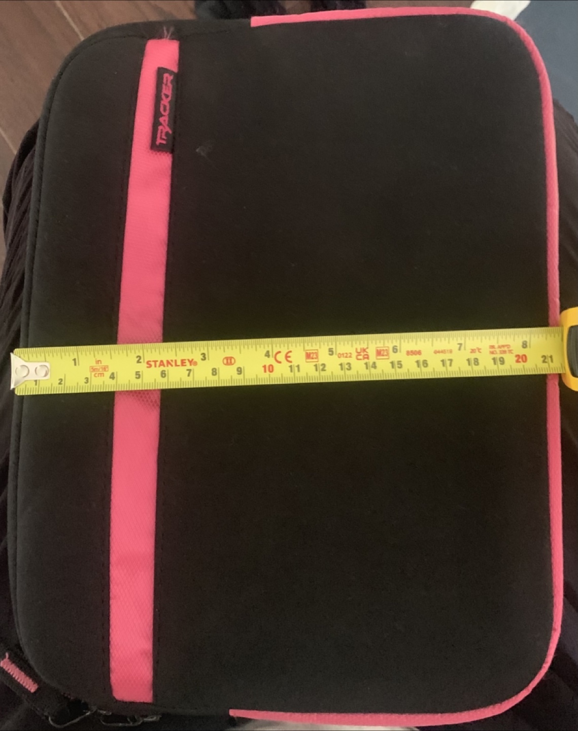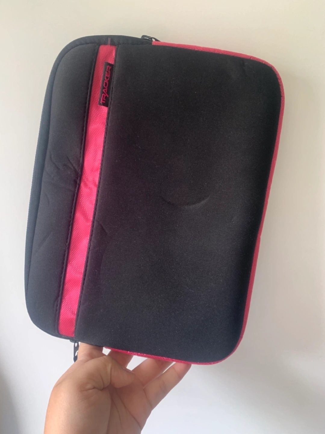 Selling a Tracker laptop case in black with pink accents! It's in good condition and perfect for protecting your laptop on the go. The case measures approximately 11 inches by 8 inches.