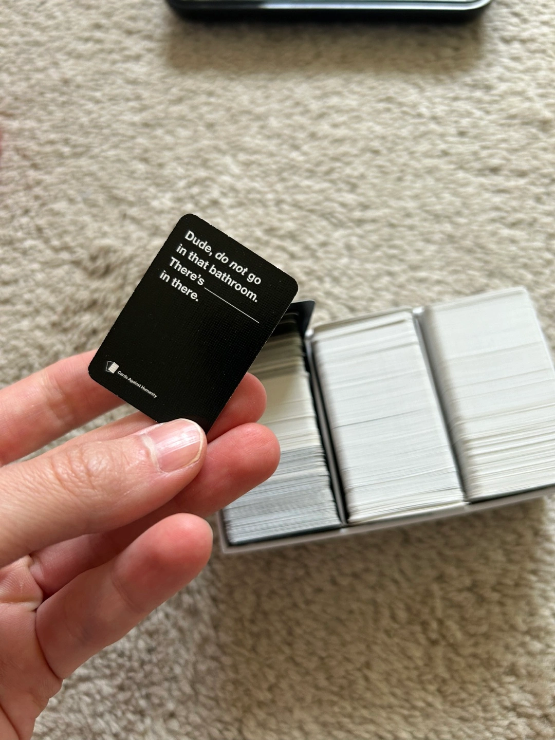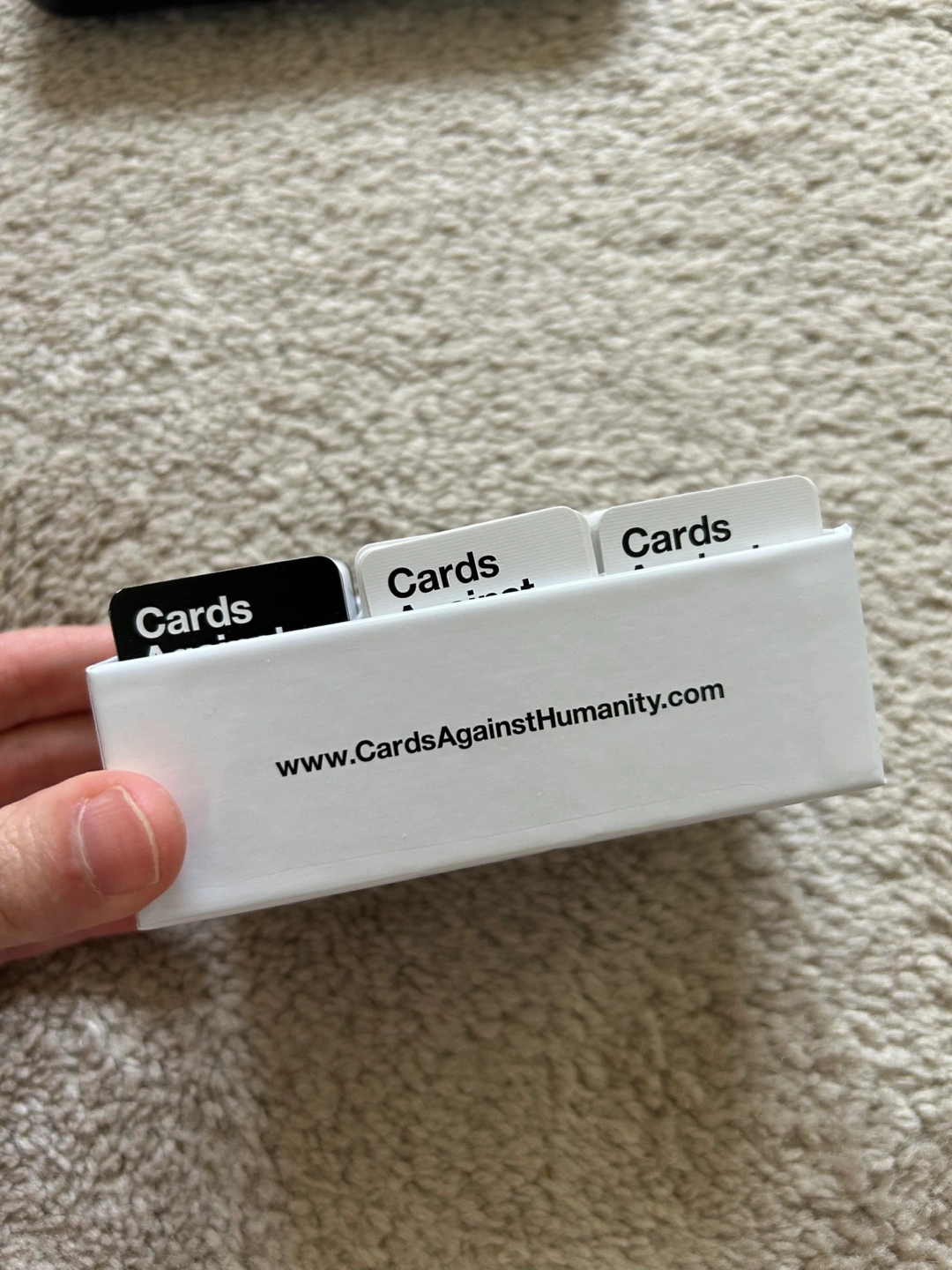 FREE tiny version of Cards Against Humanity game! Hand for scale. Lid is missing and I’m not sure if all the cards are there. Take it, I’m decluttering!