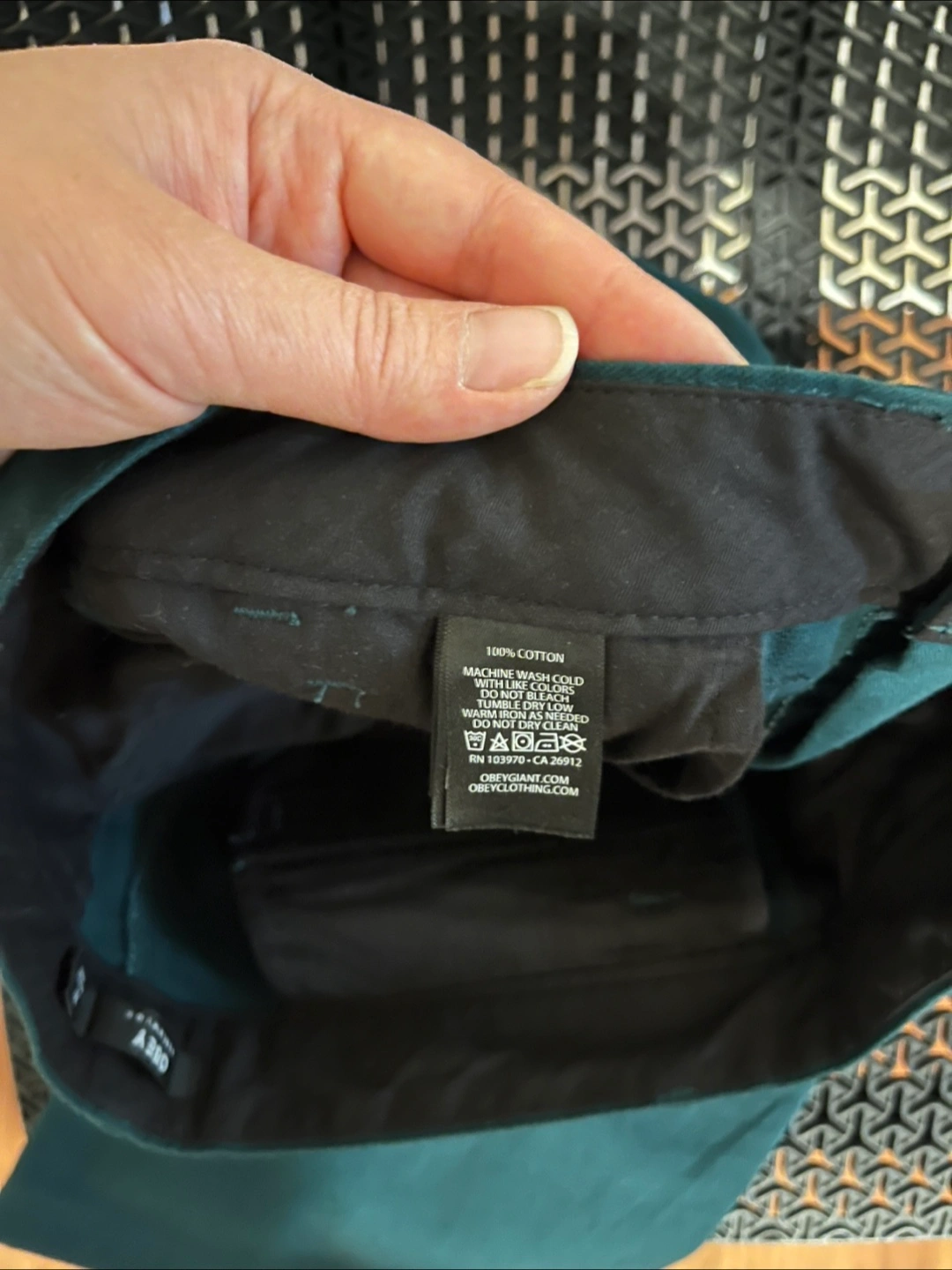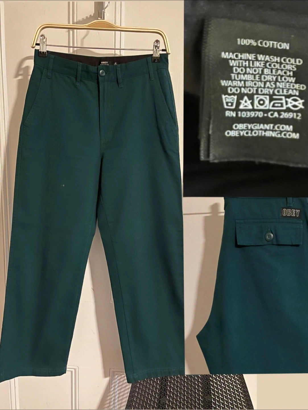 I LOVED these Obey pants. Perfect teal, spruce, or blue-green color. Regular rise, and a modest wide leg (they look structured not baggy). Midweight cotton without the stiffness of canvas.