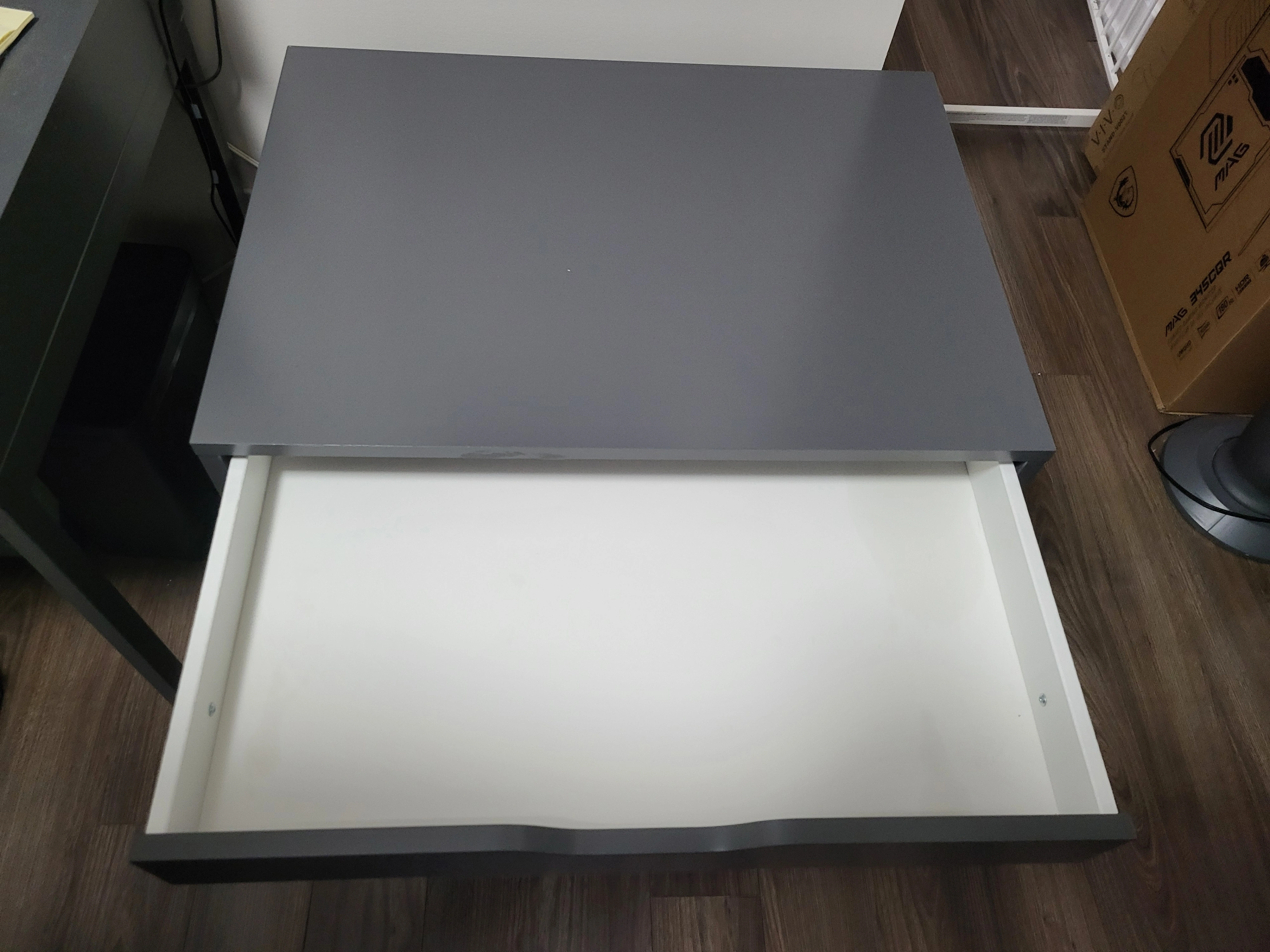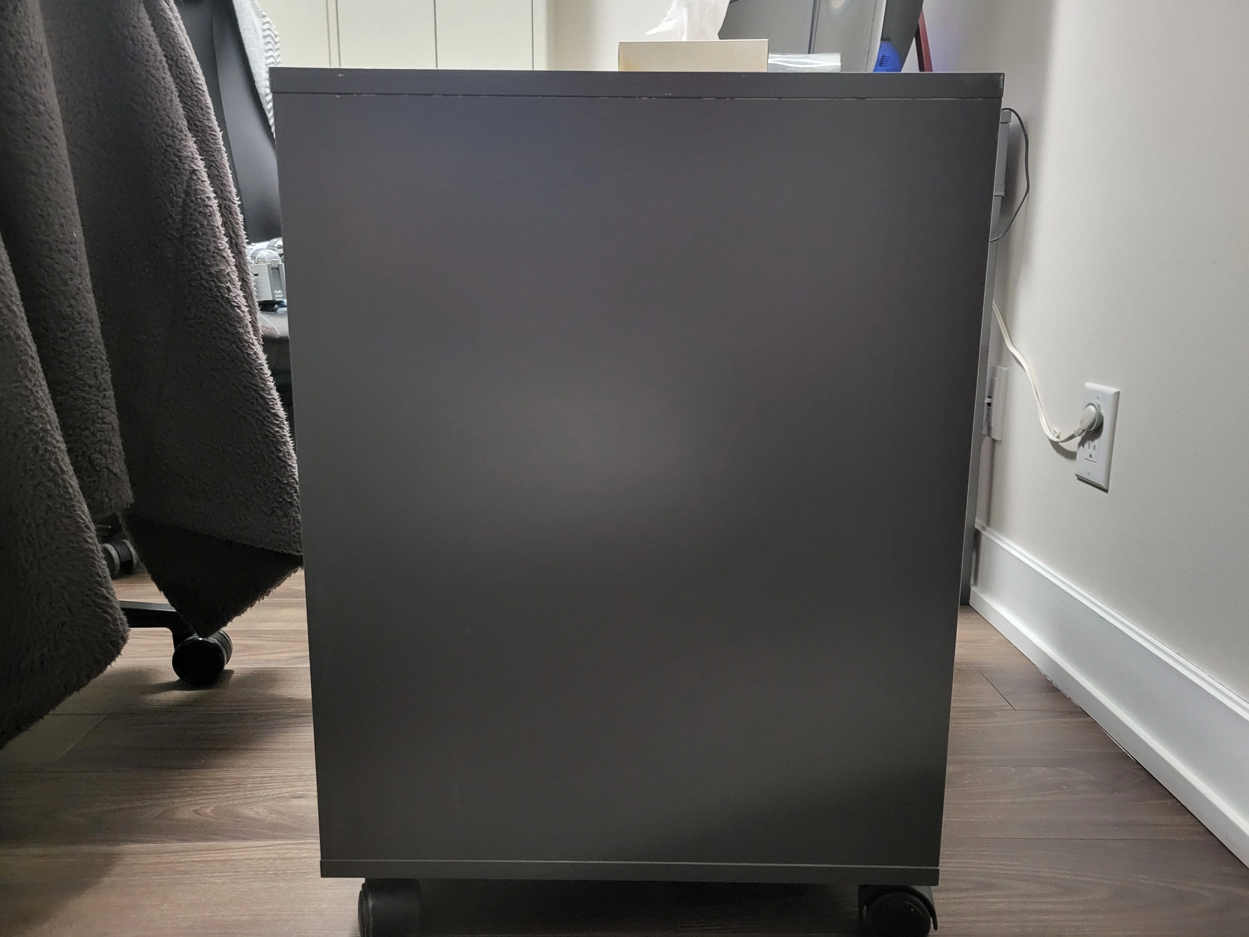 The drawer unit being sold is the Ikea ALEX in dark grey color and comes with black castors. The cabinet is gently used and in excellent overall condition with no major scratches or dings. It has 7 good sized drawers to hide all you valuables or just all your junk you don't want anyone to see. One drawer has some moisture damage and has bubbled at the bottom, damage picture provided.