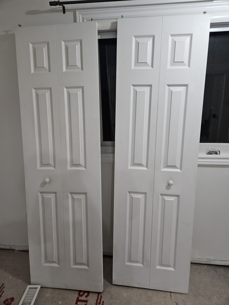 Selling a pair of white bi-fold closet doors. Each door is approximately 23 1/2 in wide and 79 in tall. They're in good condition and ready to be installed. Hardware included.