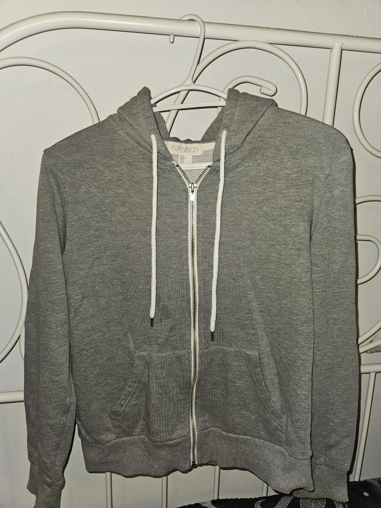 Selling a grey zip-up hoodie from Forever 21. It's in good condition and ready for a new home! Perfect for layering or wearing on its own