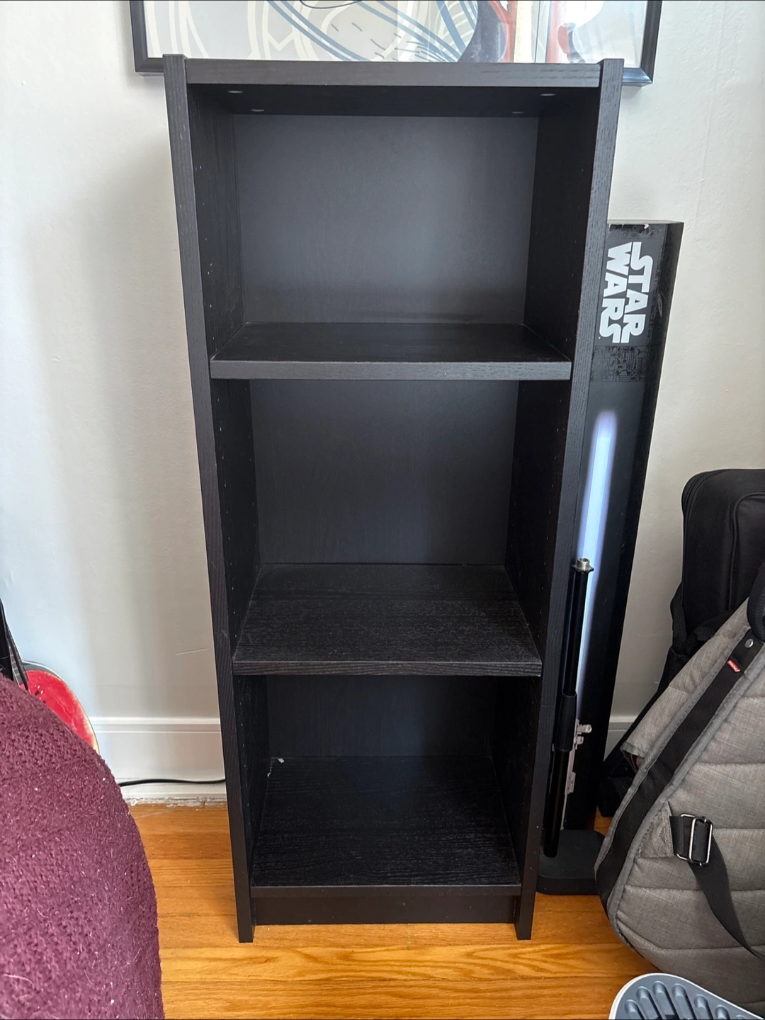 Selling a black bookshelf. It has three adjustable shelves and is in nearly perfect condition. Perfect for storing books, decorations, or other items!