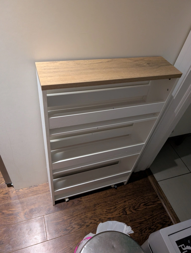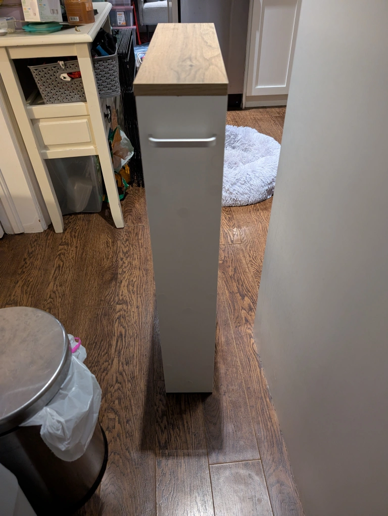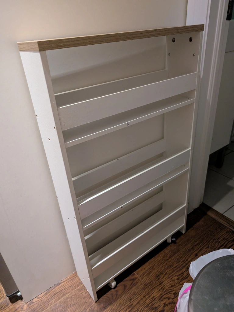 perfect for extra bathroom storage or in the laundry room, can easily fit in small spaces and roll out for access to the shelves.