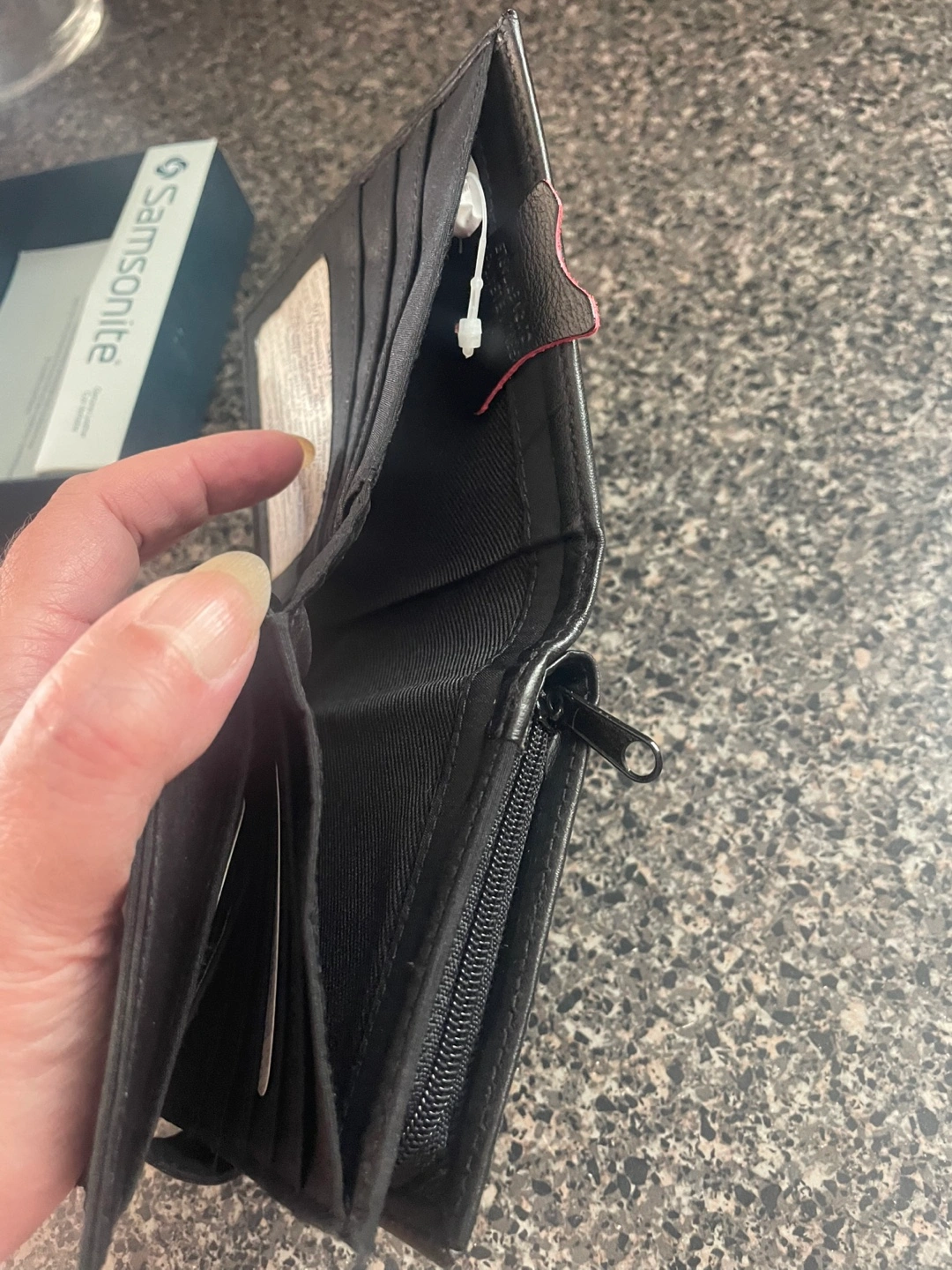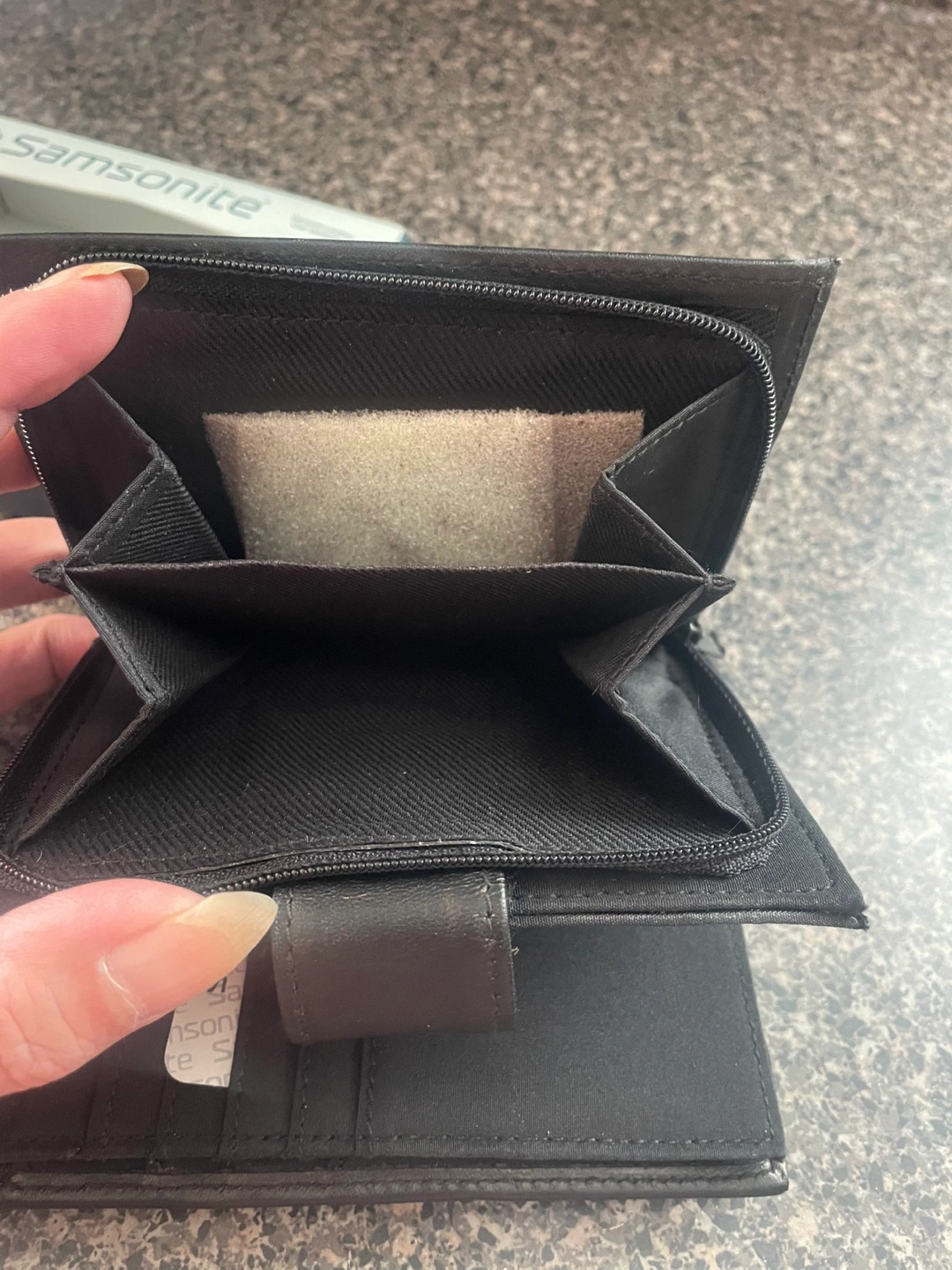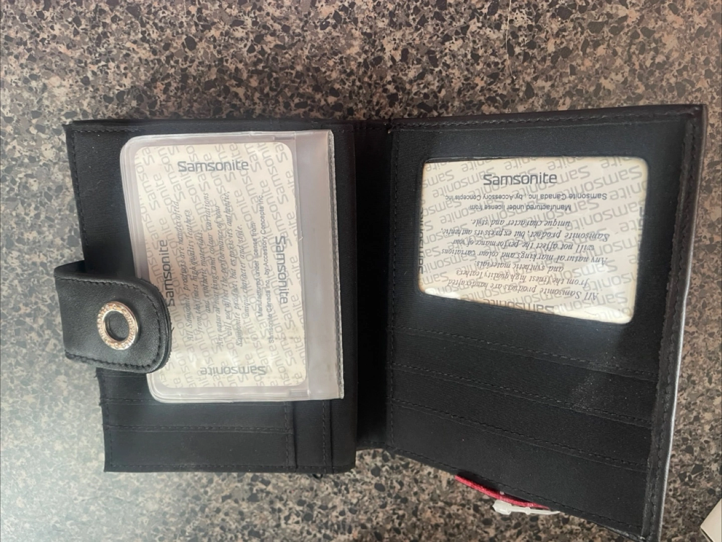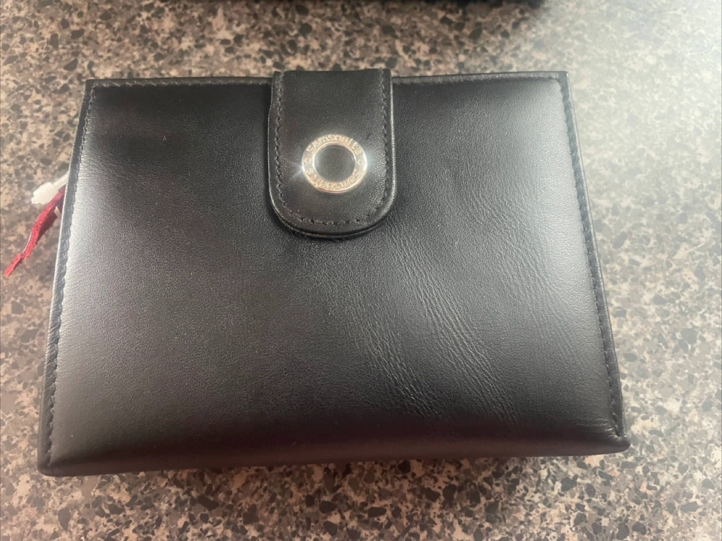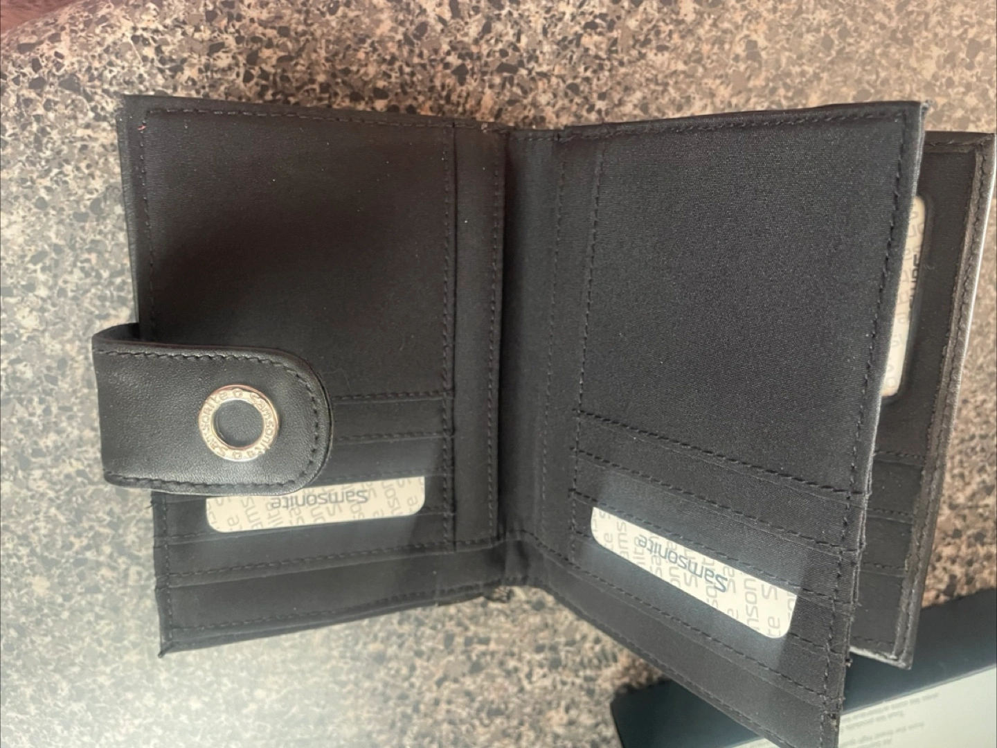 I'm selling a brand new ladies Samsonite wallet! It's a sleek black leather and comes with its original box. It is a genuine leather wallet. Perfect for everyday use!