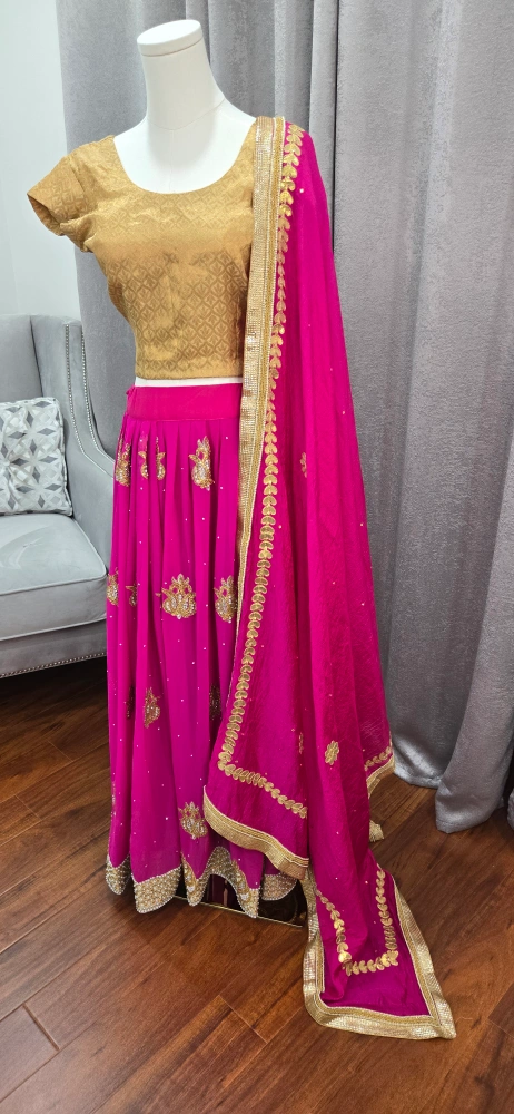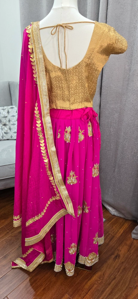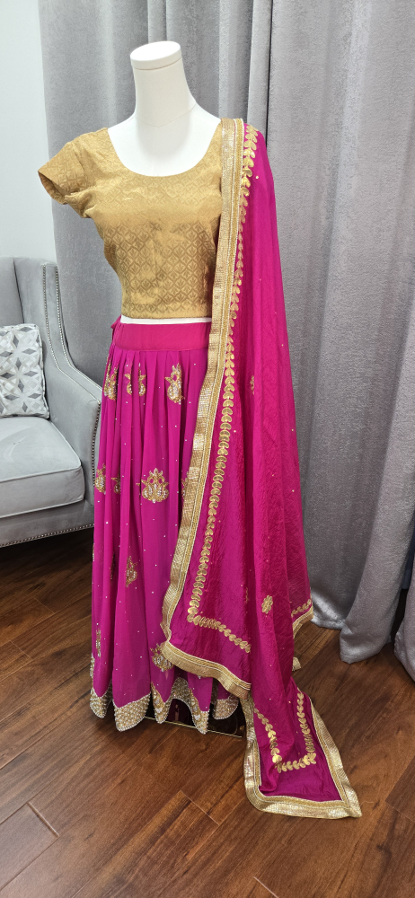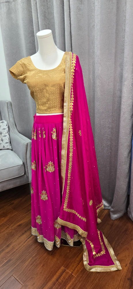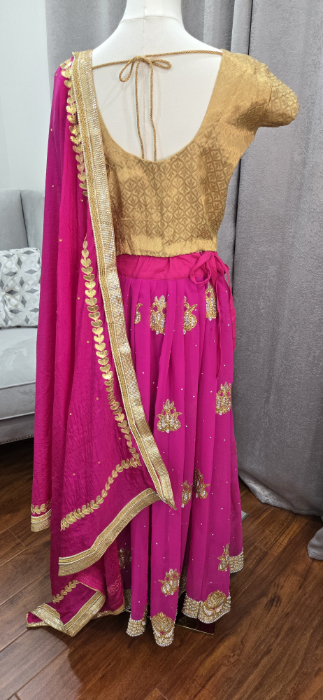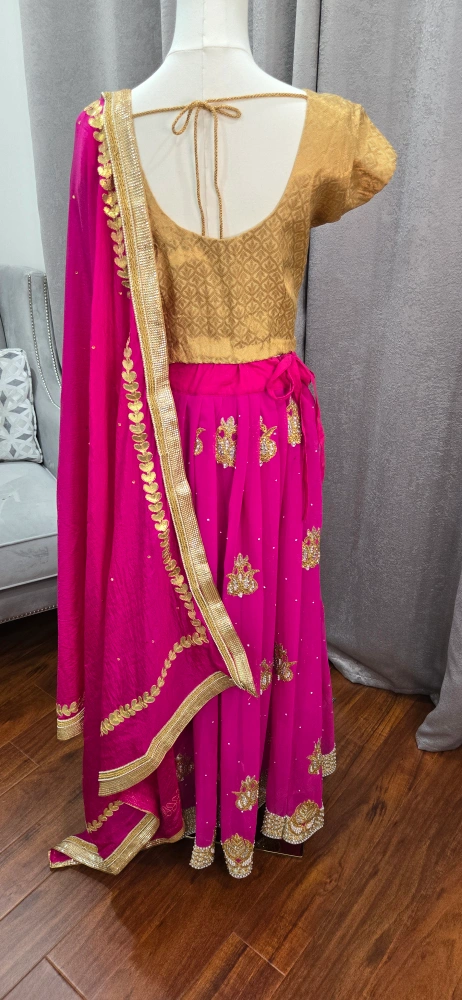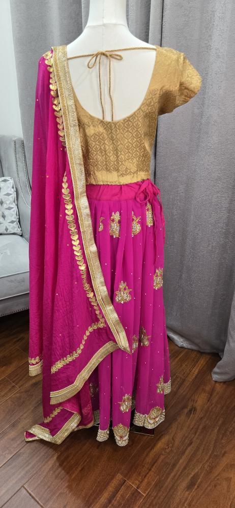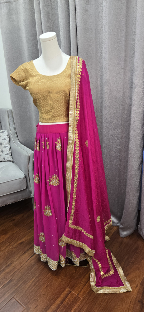 Beautiful lehenga choli set in pink and gold! The skirt is a vibrant pink with gold detailing, and the top is a lovely gold colour. Comes with a matching dupatta. Perfect for a special occasion party or Indian wedding reception attire.