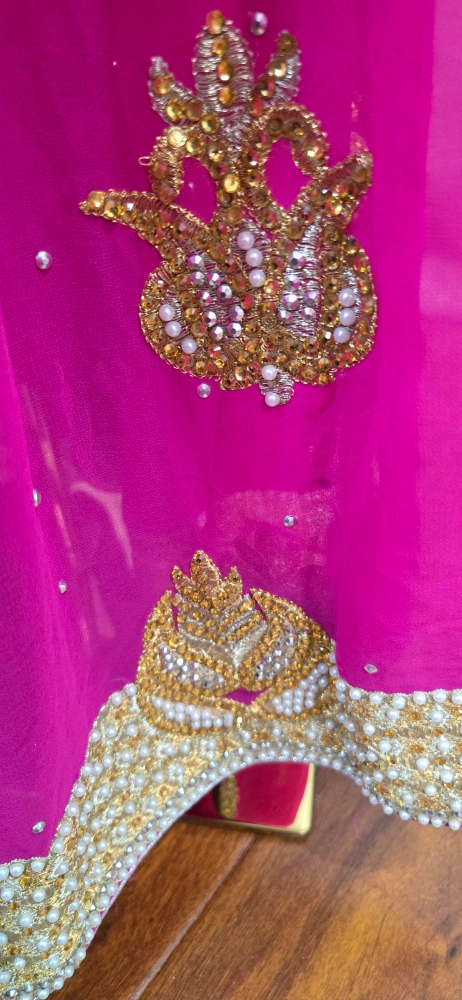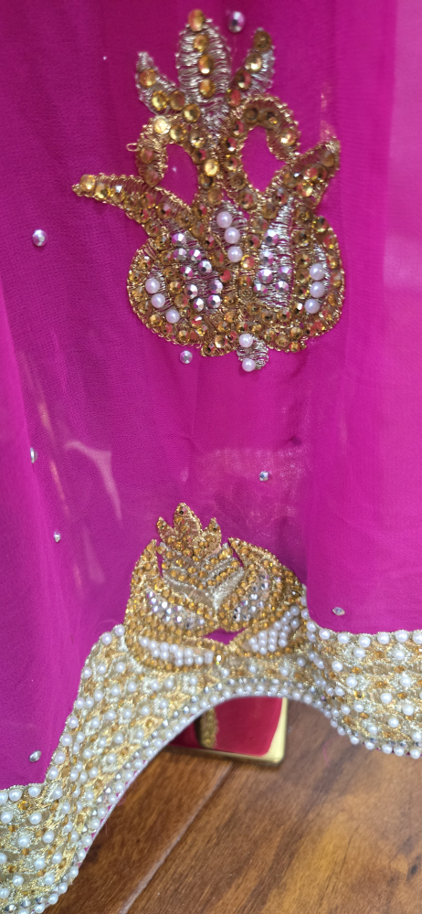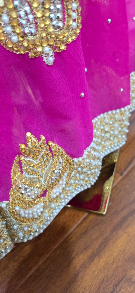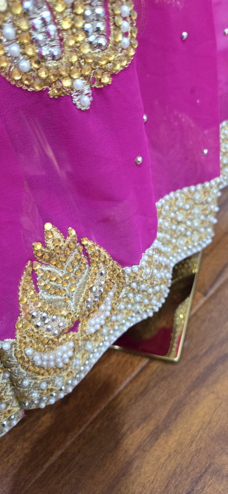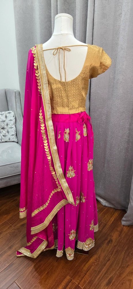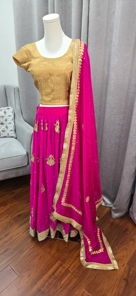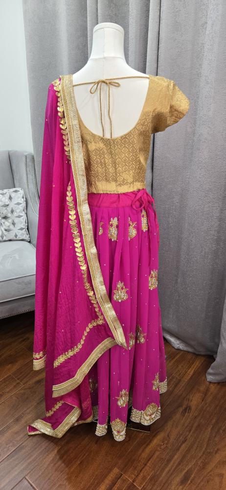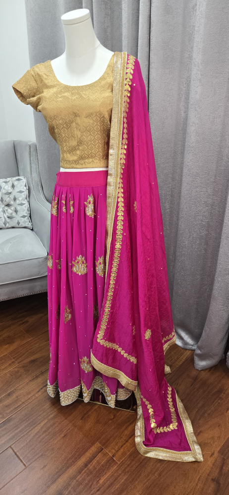 Beautiful lehenga choli set in pink and gold! The skirt is a vibrant pink with gold detailing, and the top is a lovely gold colour. Comes with a matching dupatta. Perfect for a special occasion party or Indian wedding reception attire.