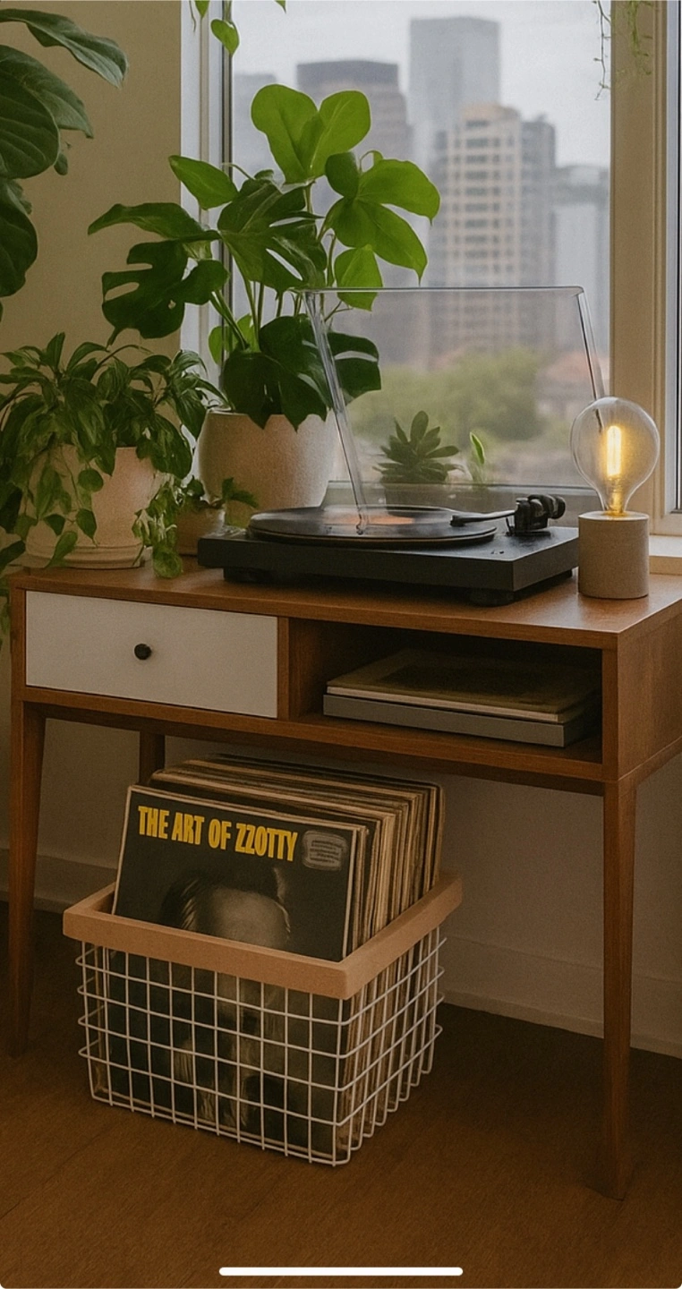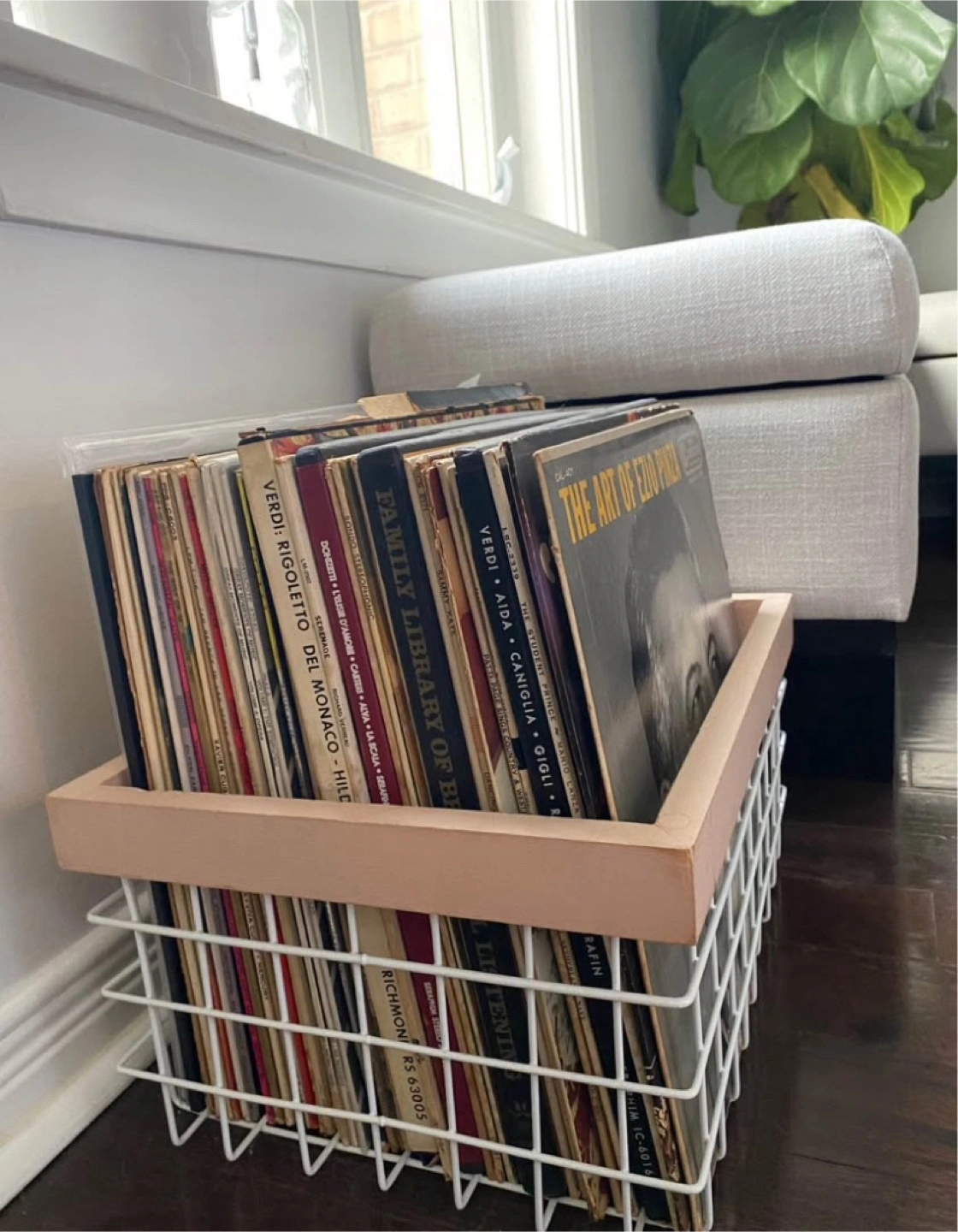 Selling a wire basket (used to store vinyl but can use for whatever). The basket has a pale wood trim and white wire. 11”x19”