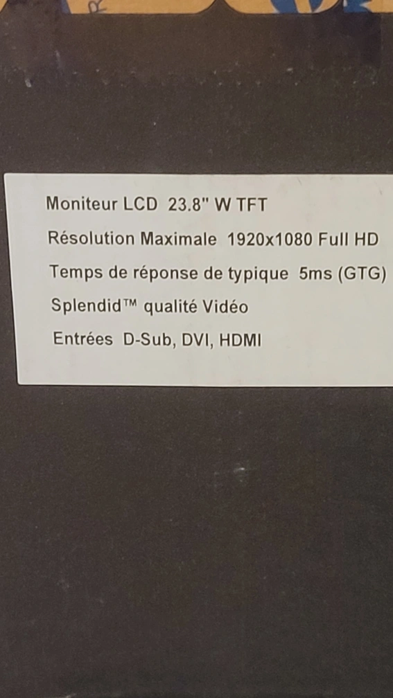 Selling a brand new ASUS VA24EHEY monitor, still in its original box! This is a 23.8" LCD monitor with a maximum resolution of 1920x1080 Full HD. It features a 5ms response time and Splendid Video Intelligence Technology. It has D-Sub, DVI, and HDMI inputs.