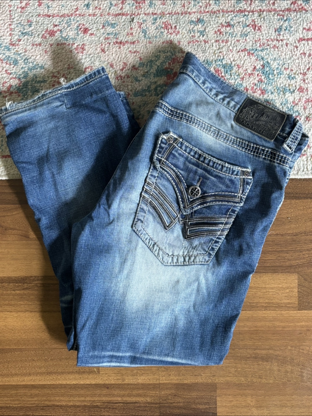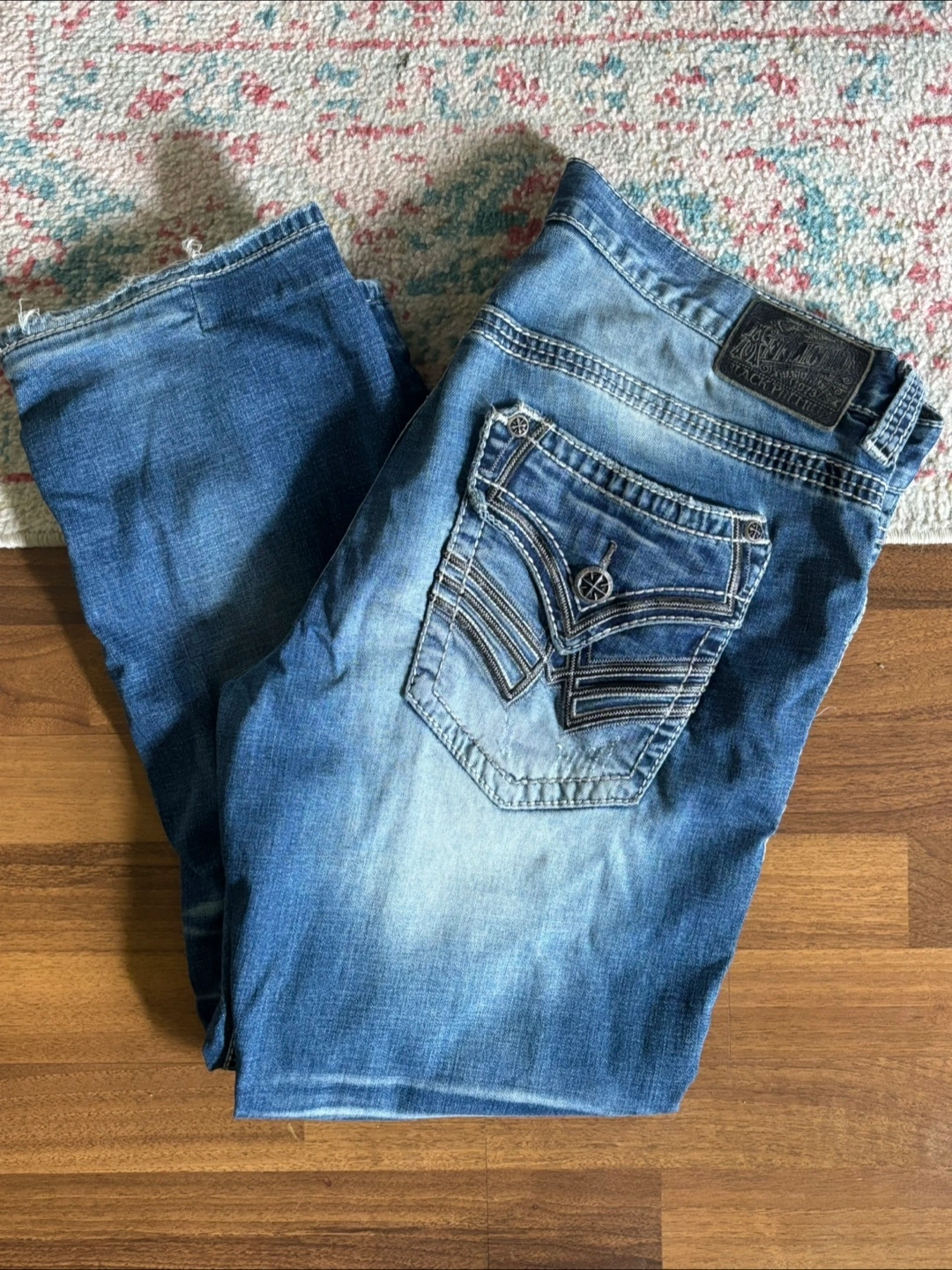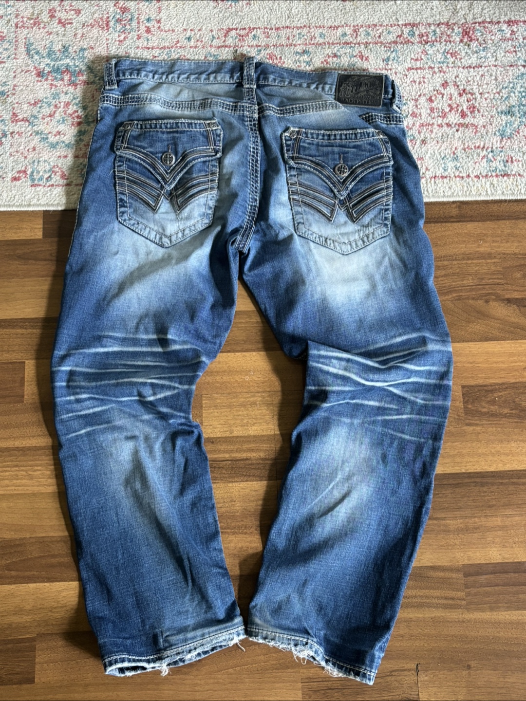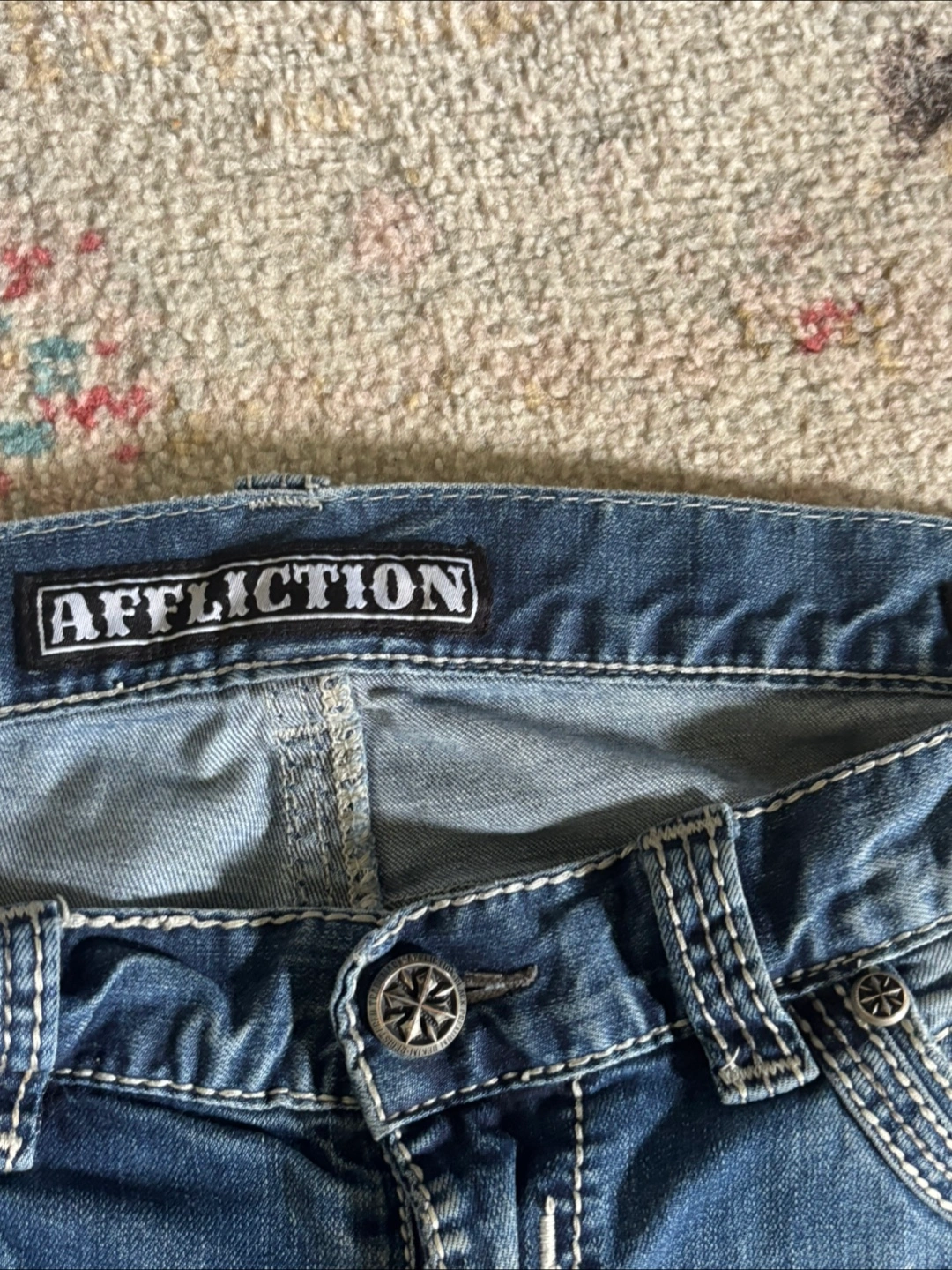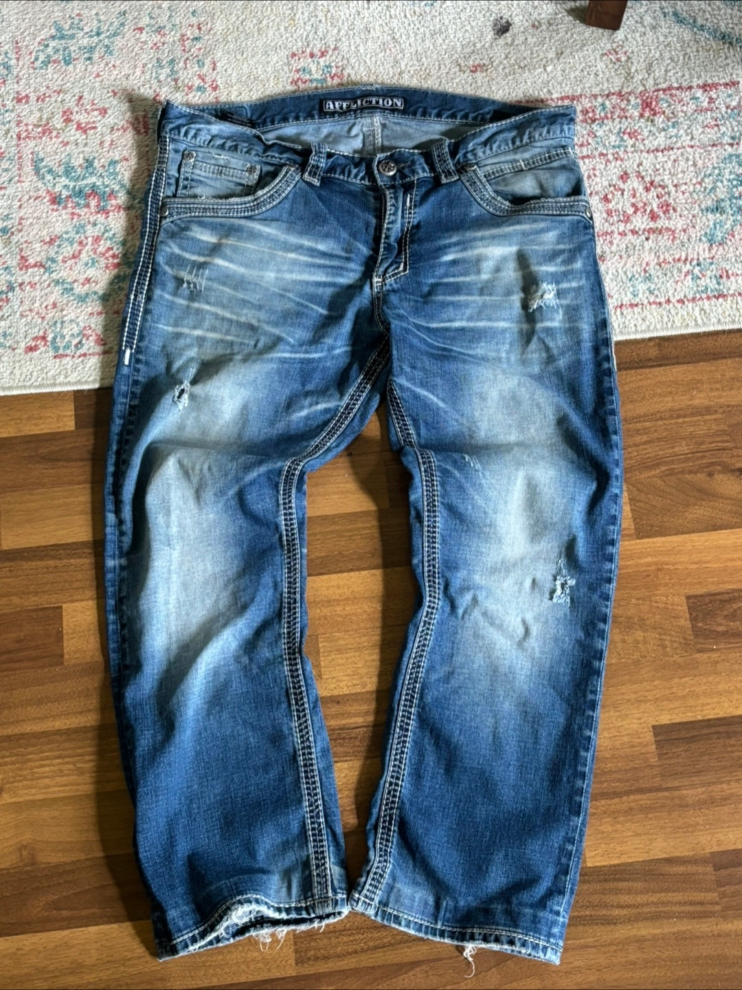 Selling a pair of Affliction jeans. They're in good condition with a unique design on the pockets and a stylish wash. Perfect for adding some edge to your wardrobe!