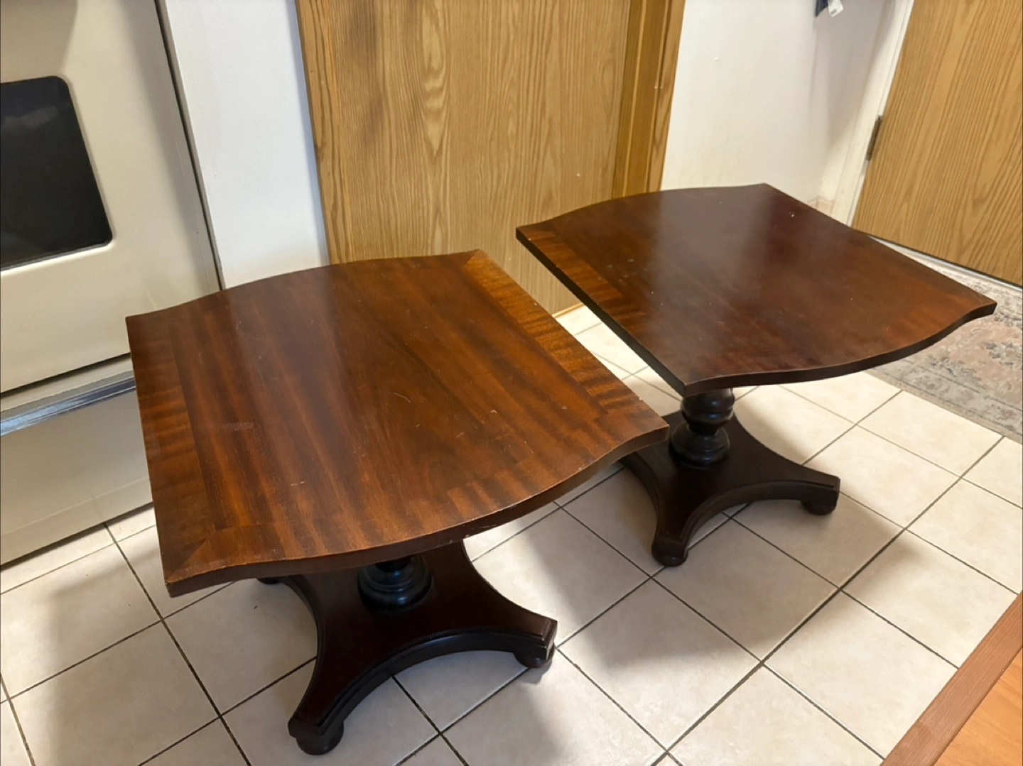 I'm selling 70s two side tables with a dark wood finish. They feature a classic pedestal design and would look great in a living room or bedroom. They are in good condition and ready for a new home