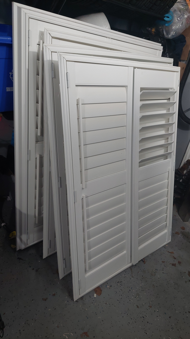 Selling some white California shutters. They're in good condition and ready to install in your home. These shutters are perfect for adding a touch of elegance and privacy to any room.