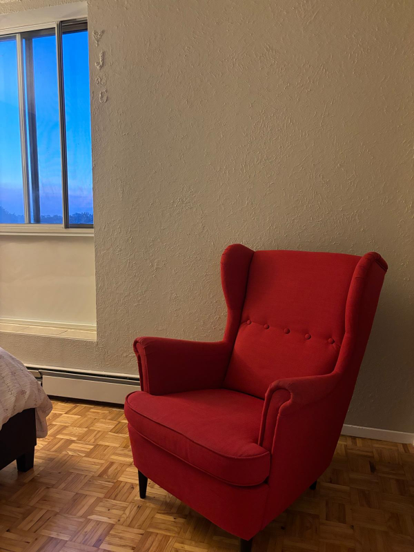 A vibrant red wingback armchair that's perfect for adding a pop of colour to any room! It's in great condition and ready to be your new favourite reading spot