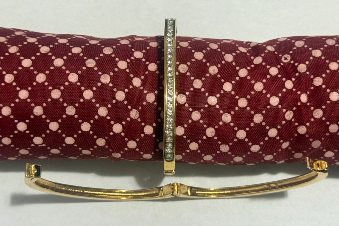 Selling a set of two gold tone bangle bracelets. One bracelet has a row of small clear stones. The bracelets are approximately 2.5 inches in diameter.