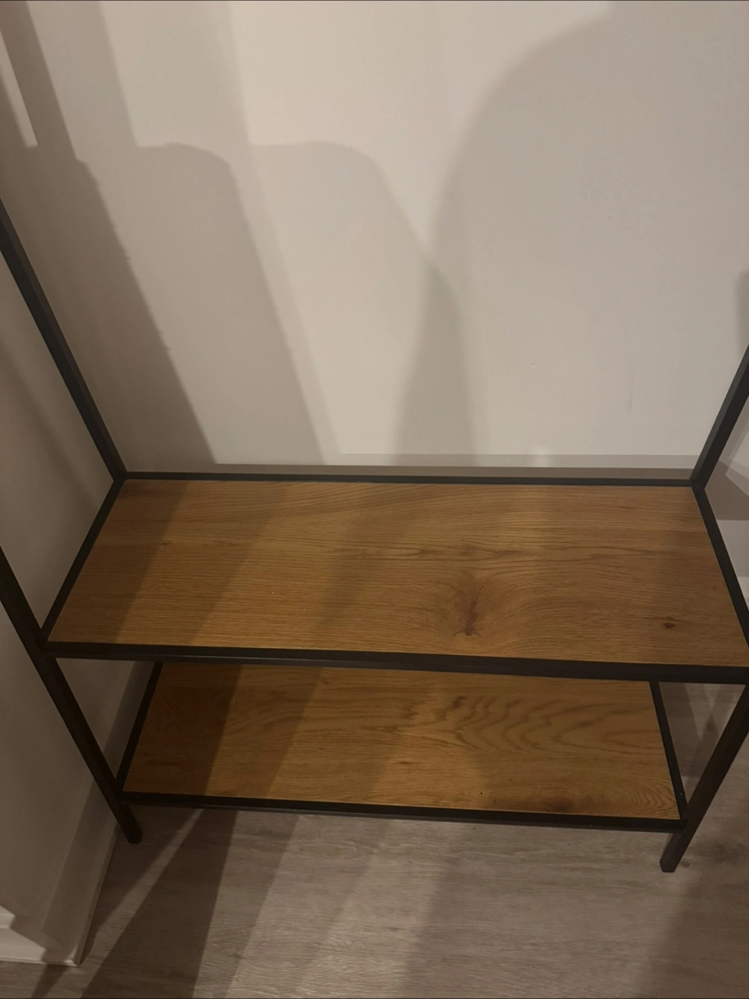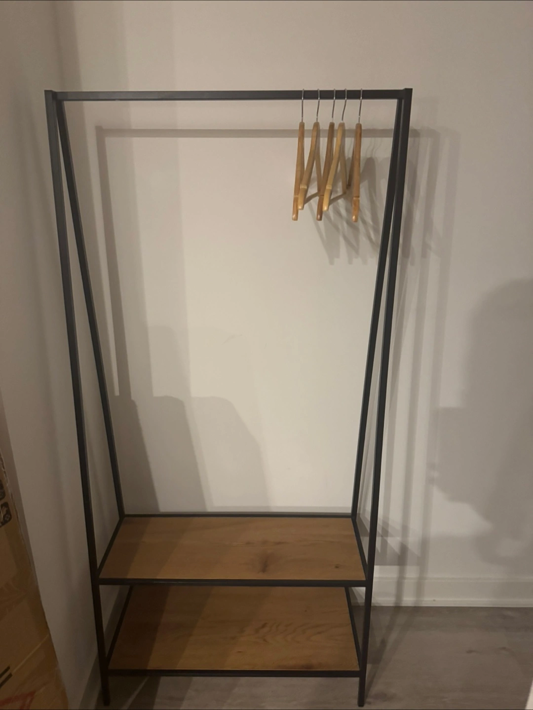 Selling this chic and sturdy 30-inch clothes rack with wood-look shelves and a sleek black frame. Super versatile for hanging clothes and storing shoes or baskets. No major damage — just doesn’t fit in my new space anymore.
