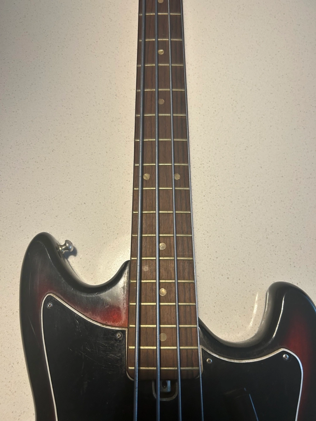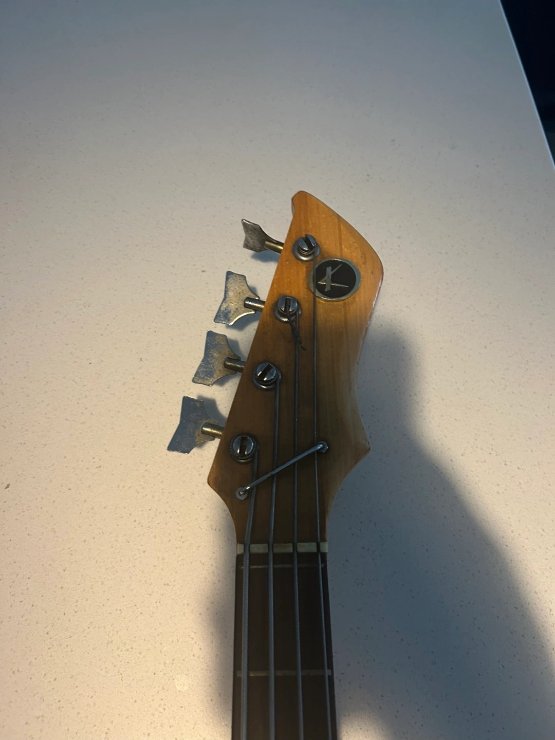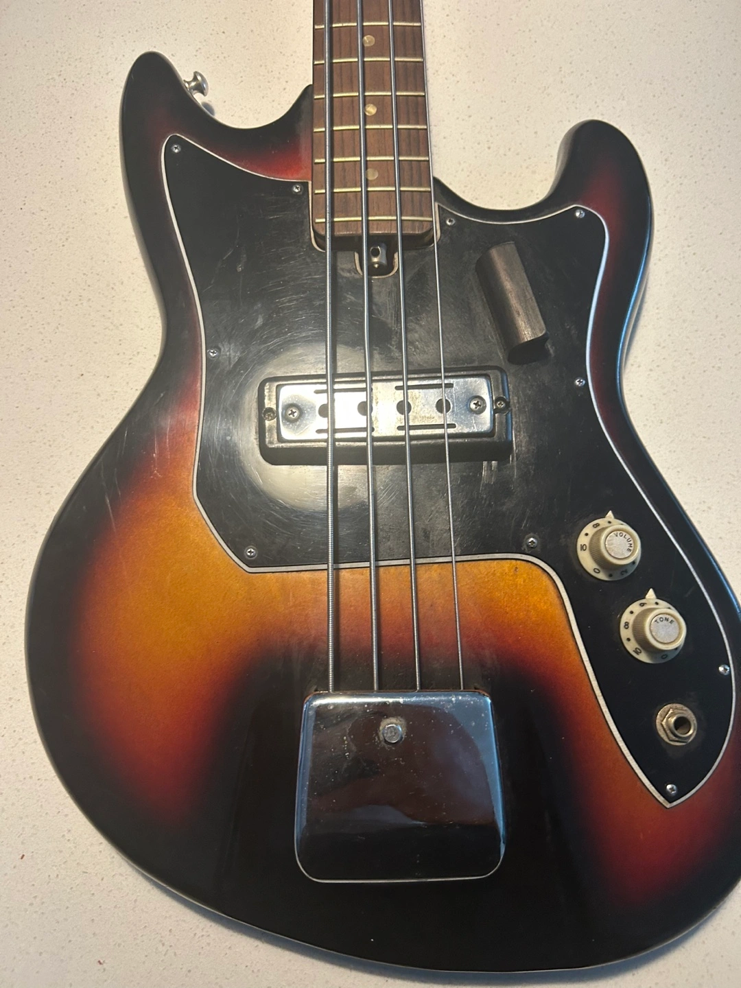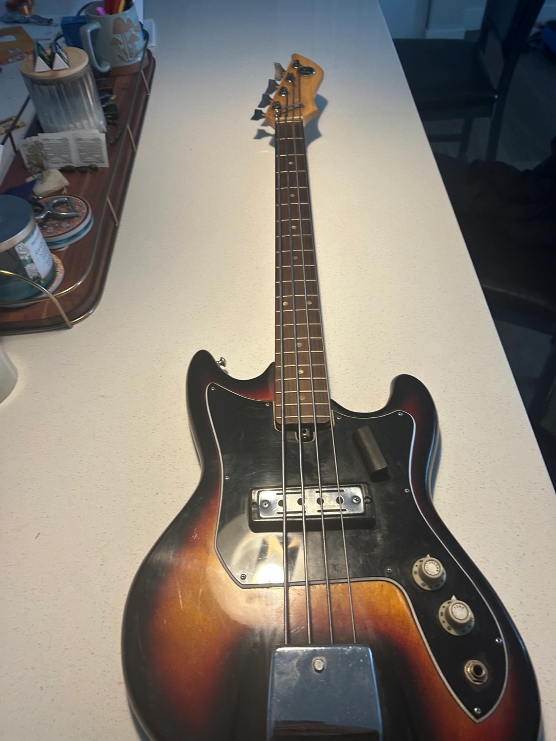 Selling a vintage Kay electric bass guitar. It has a cool, retro look with a sunburst finish and some wear that adds to its character. Perfect for someone looking for a unique bass with a vintage vibe