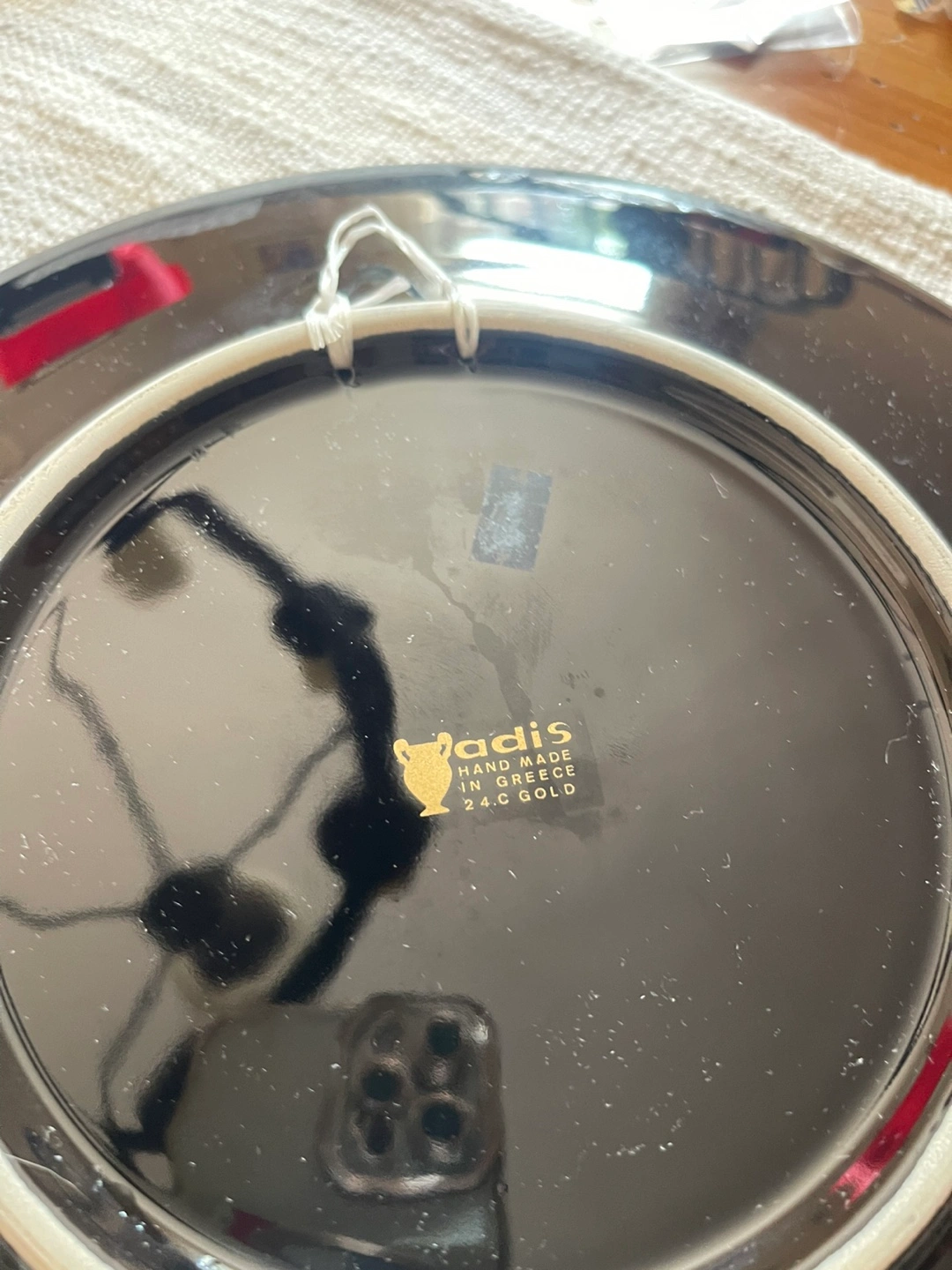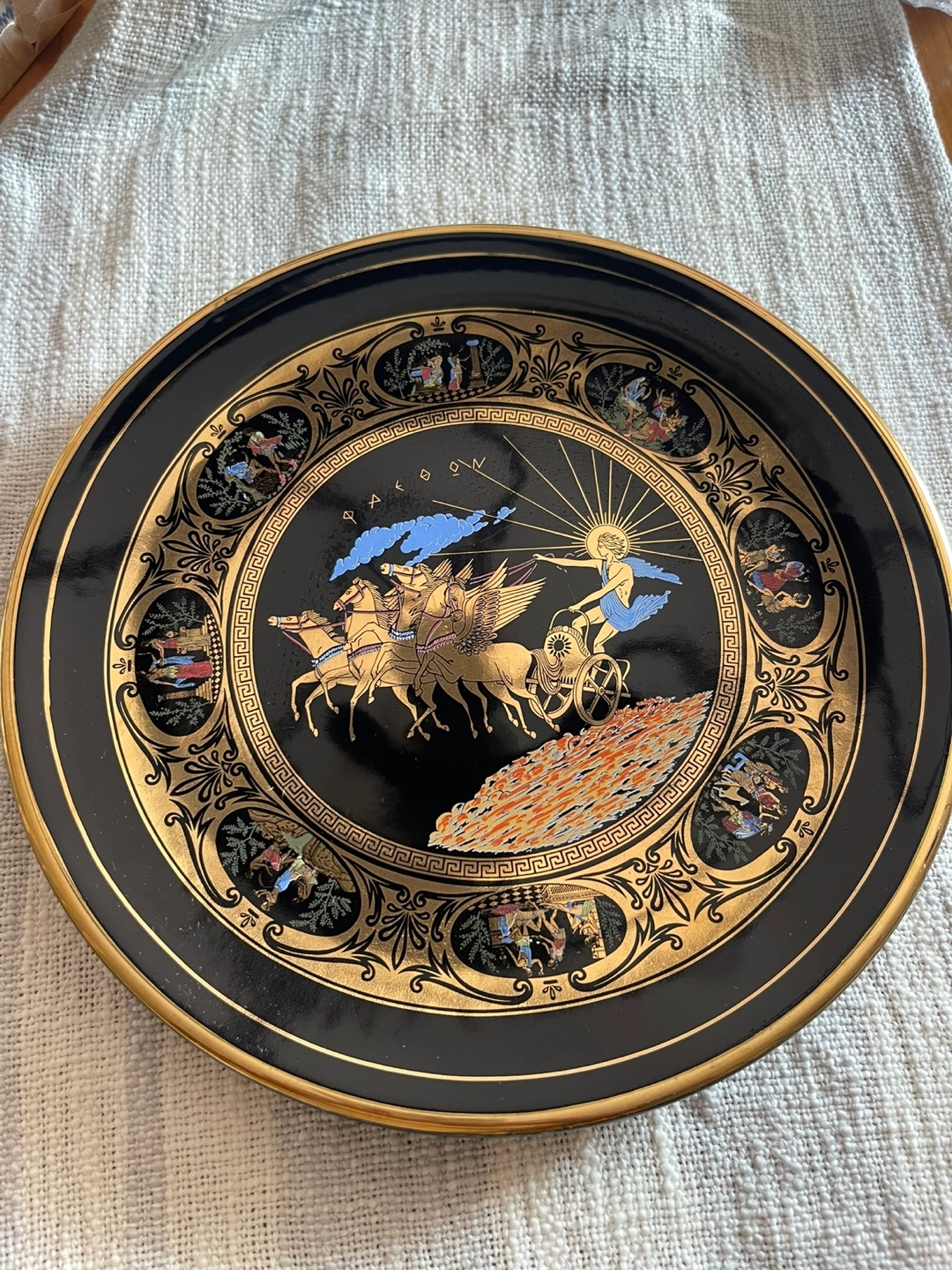 This is a beautiful decorative plate that was handmade in Greece. It features a stunning design with 24-carat gold accents. It's in excellent condition and would make a lovely addition to any home. This stunning collector’s plate by Adis features a richly detailed depiction of Phaethon—the mythological son of Helios—riding the chariot of the sun across the sky. 11x11 round