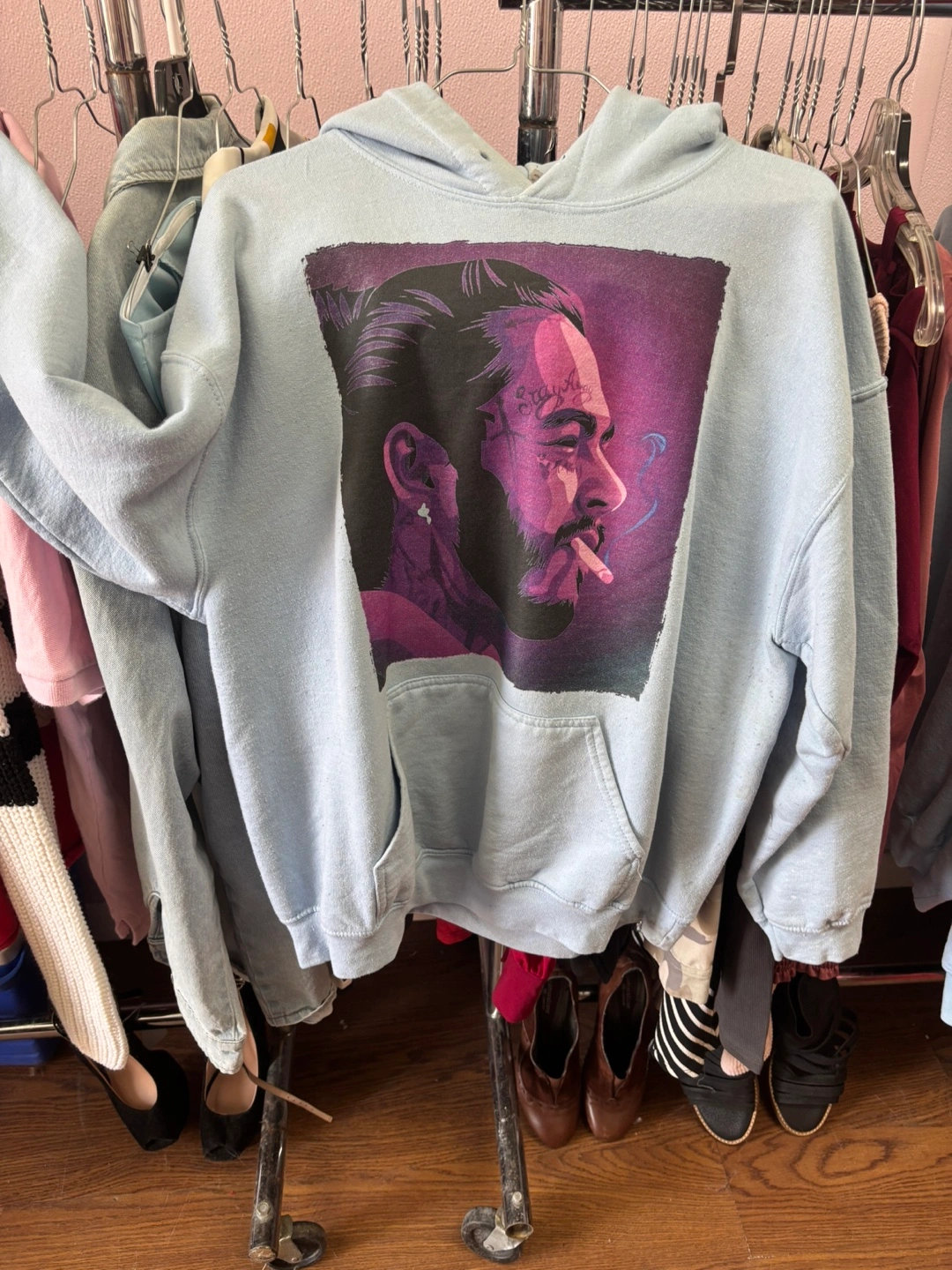 Here's a light blue hoodie featuring post Malone a graphic print. It's in good condition and ready for a new home! Perfect for casual wear or layering on cooler days.