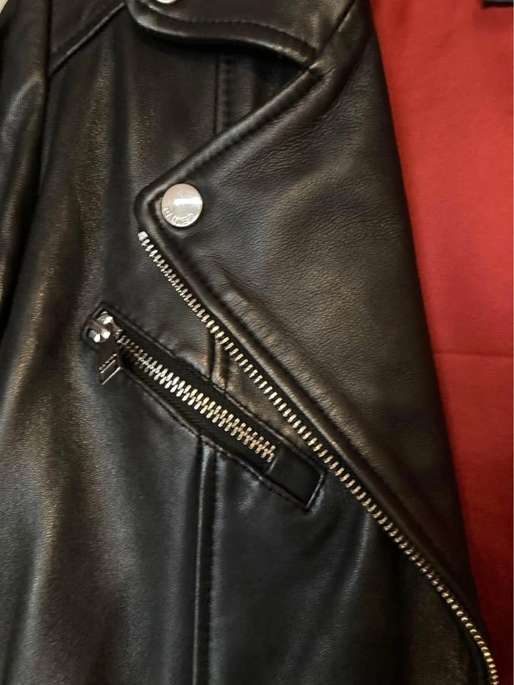 Danier genuine leather moto jacket, with multiple zip details, zippered pockets, a detachable belt, and beautiful deep red lining. In fantastic condition (no rips or marks), the leather is super soft and has a great sheen to it. Size XS