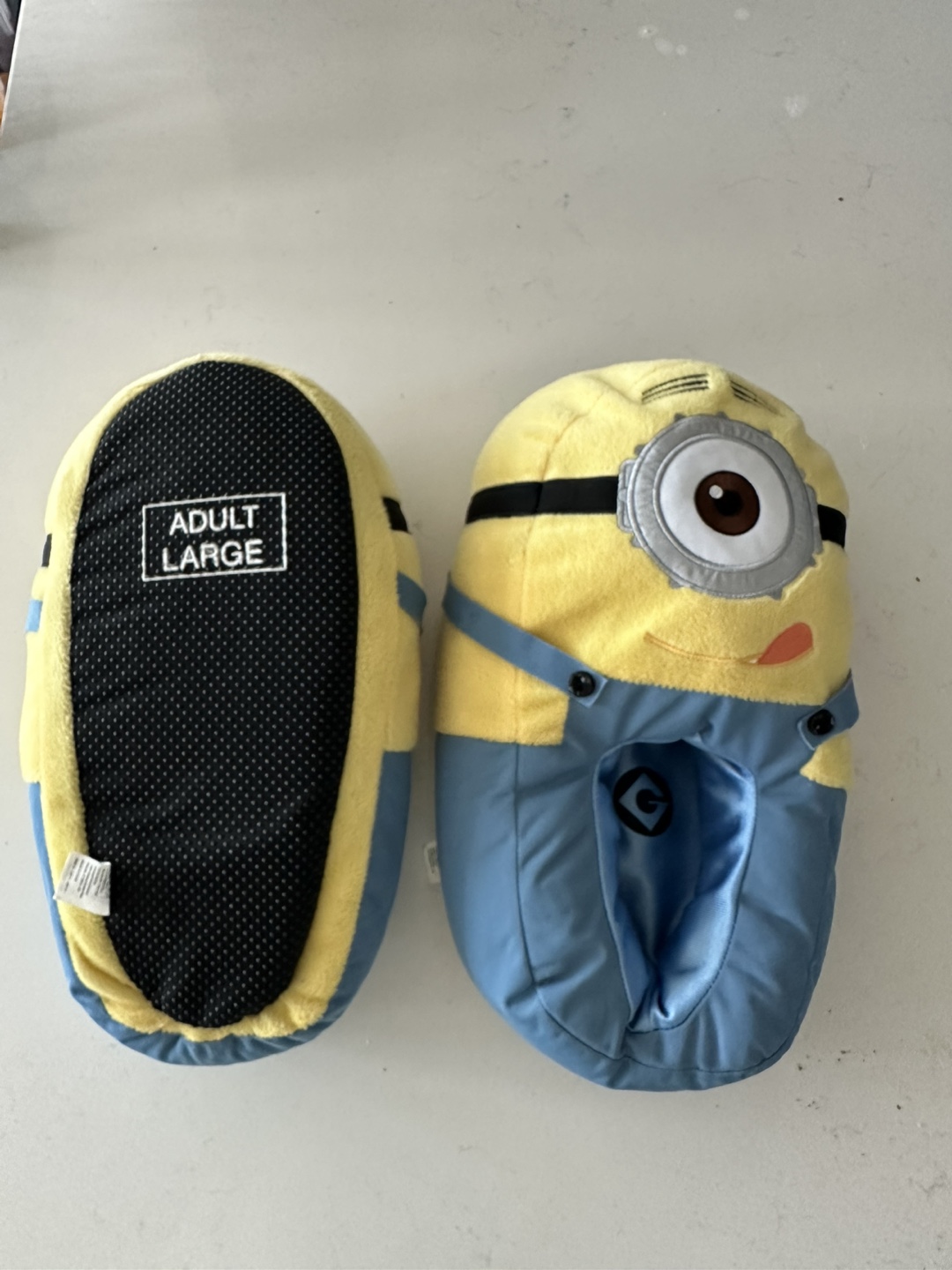 Keep your feet cozy with these adorable Minions slippers! They are adult size large and feature the classic Minion design with yellow and blue colours. Perfect for lounging around the house!