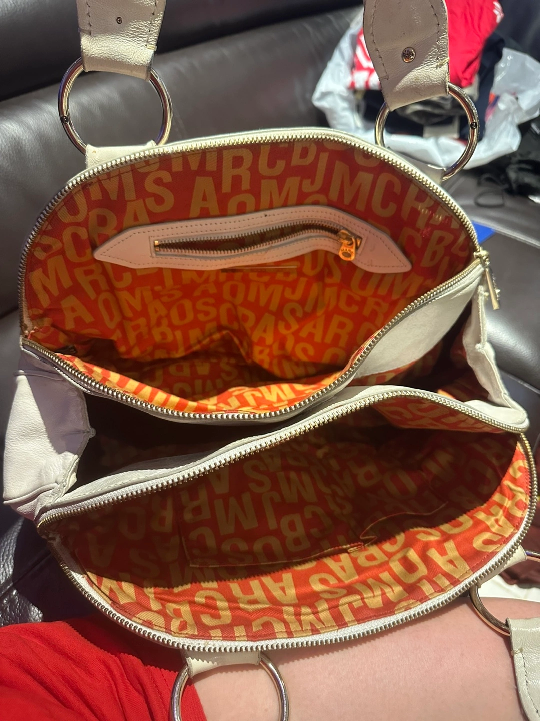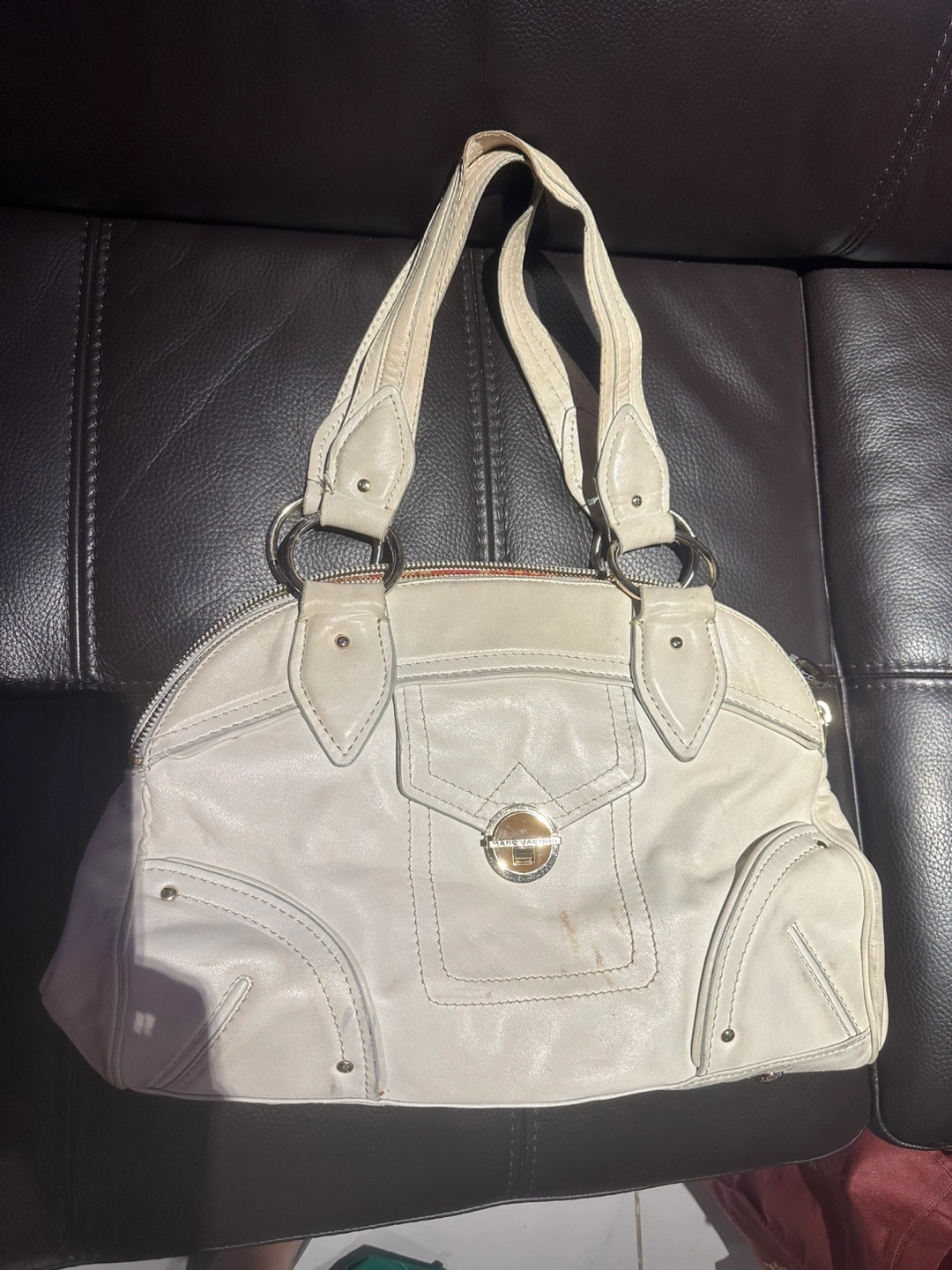 Selling a stylish Marc by Marc Jacobs satchel! This bag features a unique design with metal ring detailing on the straps and a vibrant orange interior. The exterior is a beautiful white leather, perfect for adding a touch of elegance to any outfit. It's in great condition and ready for a new home! It just need some cleaning. It will be a nice bag. Need to clean up my closet.