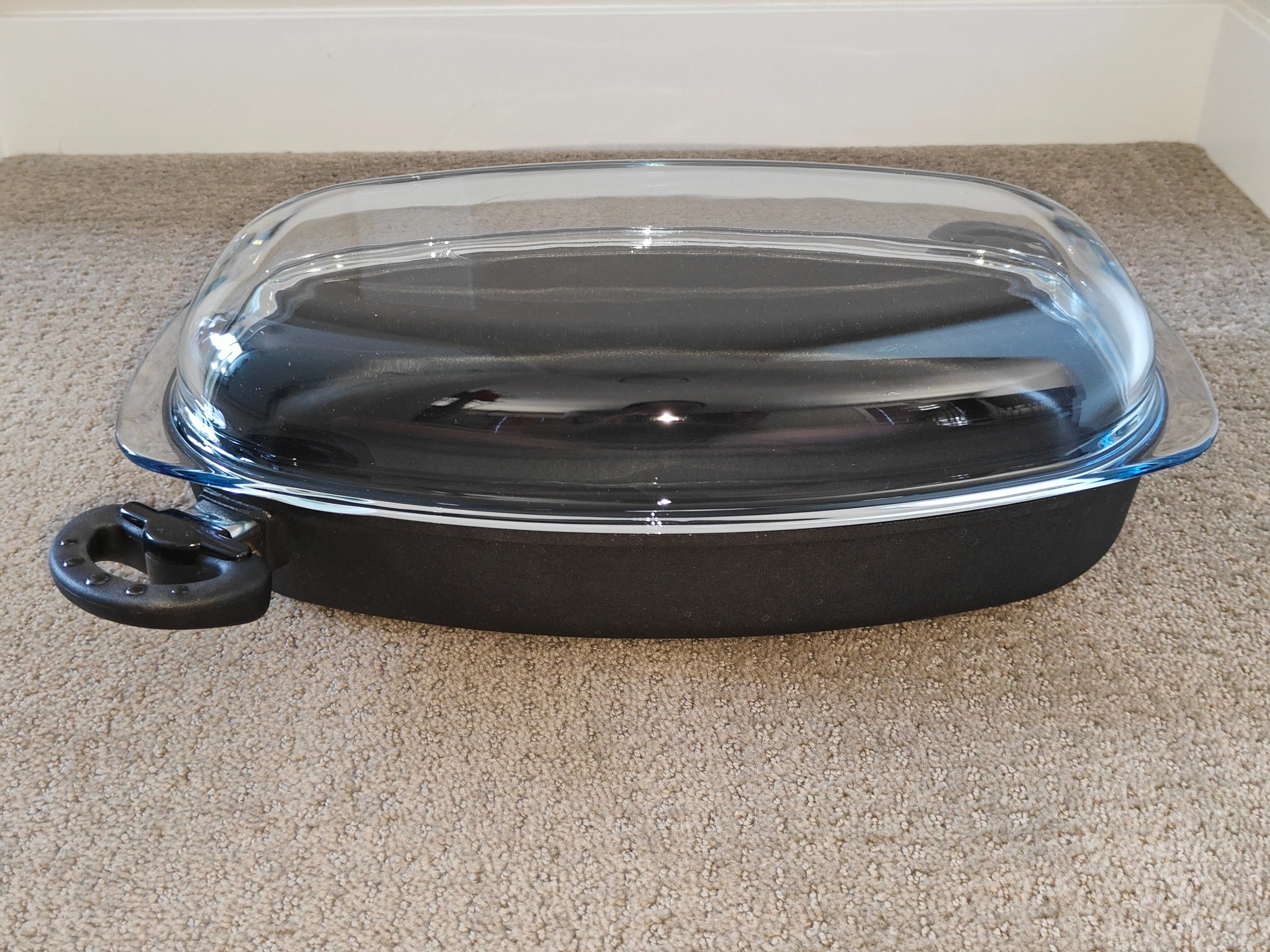 I am selling a Titanium Exclusive Covered Glass Lid Roaster / Casserole Dish in lightly used, excellent condition. Only used once. Originally paid $600+. Made in Germany. Upgrade your kitchen cookware with this Titanium Exclusive Covered Roaster, perfect for baking, roasting, and serving. This versatile piece features a heavy-duty nonstick base and a tempered glass lid, ideal for oven-to-table use. The durable build and stylish design make it a reliable and attractive addition to any kitchen. Includes Glass Lid with energy saving, see-through cooking with the heat-resistant, hardened cover made of borosilicate glass. Glass lids are oven-proof up to 260 degrees Celsius (500° F).