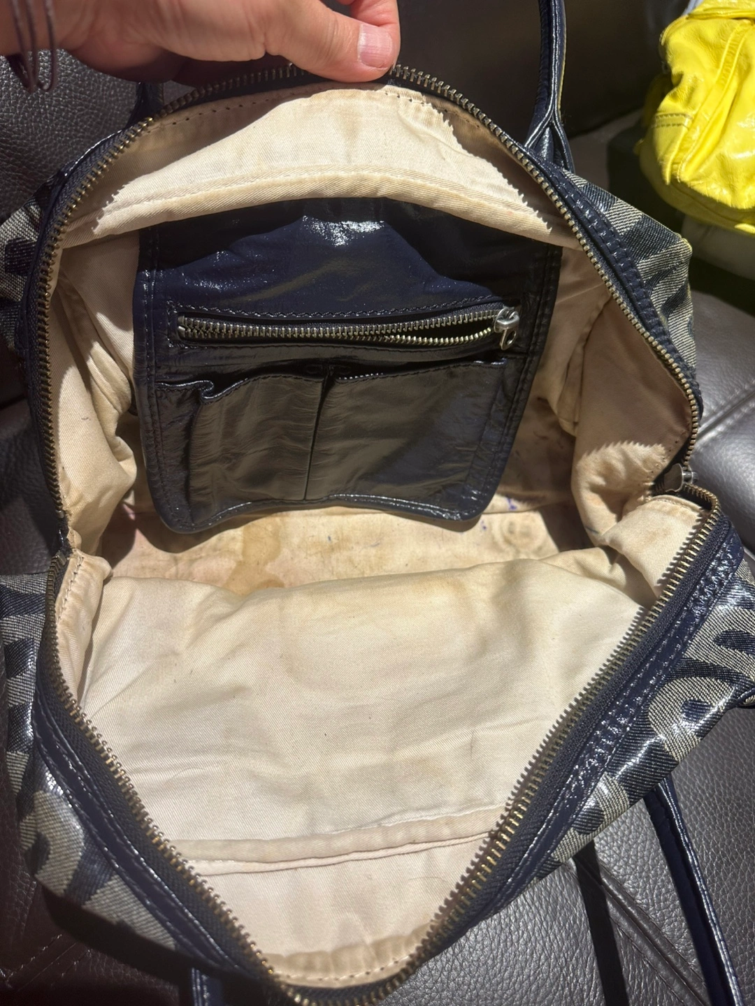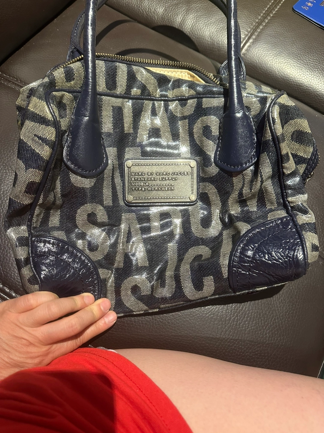 Selling a Marc by Marc Jacobs satchel. It features a unique design with the brand's name prominently displayed. The bag has a zipper closure and interior pockets for organization. Please note that there are signs of use, as shown in the pictures. It just needs cleaning. It will be a nice bag. Need to clean up my closet.