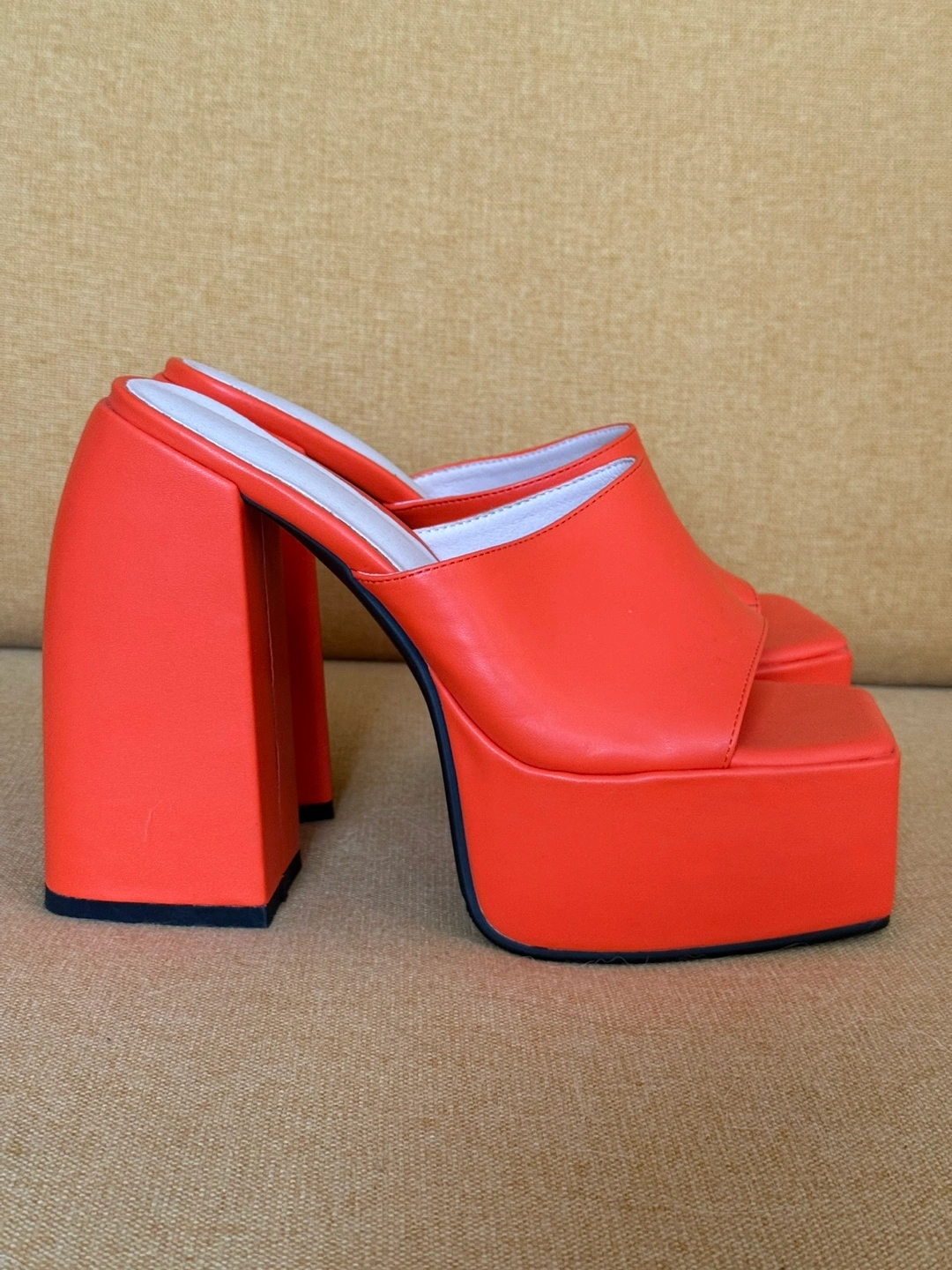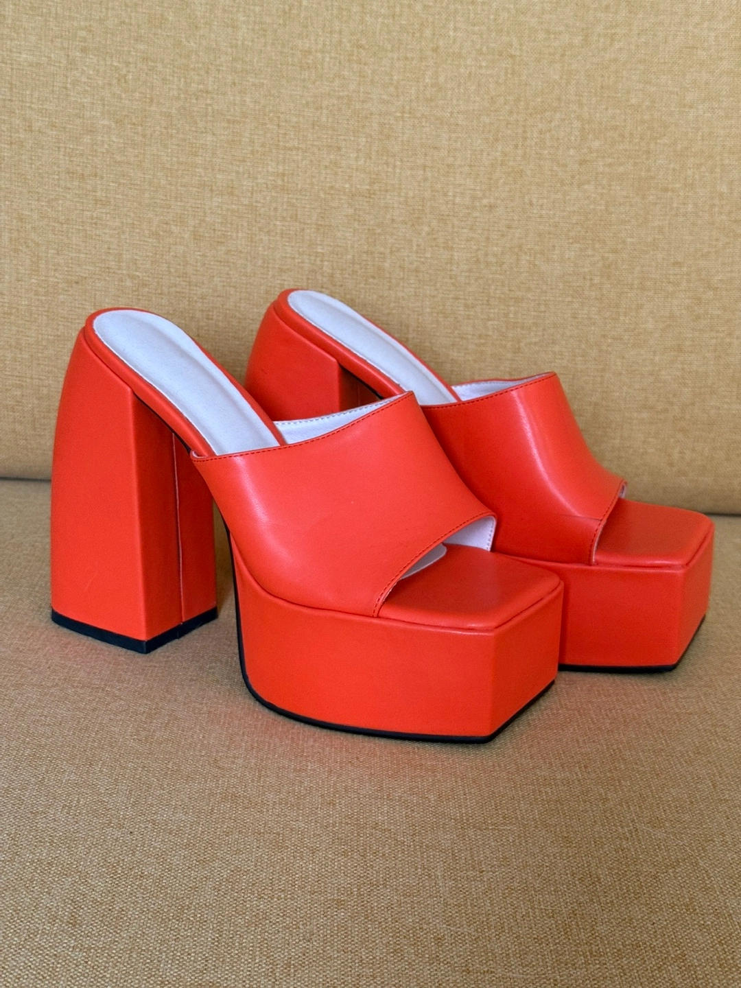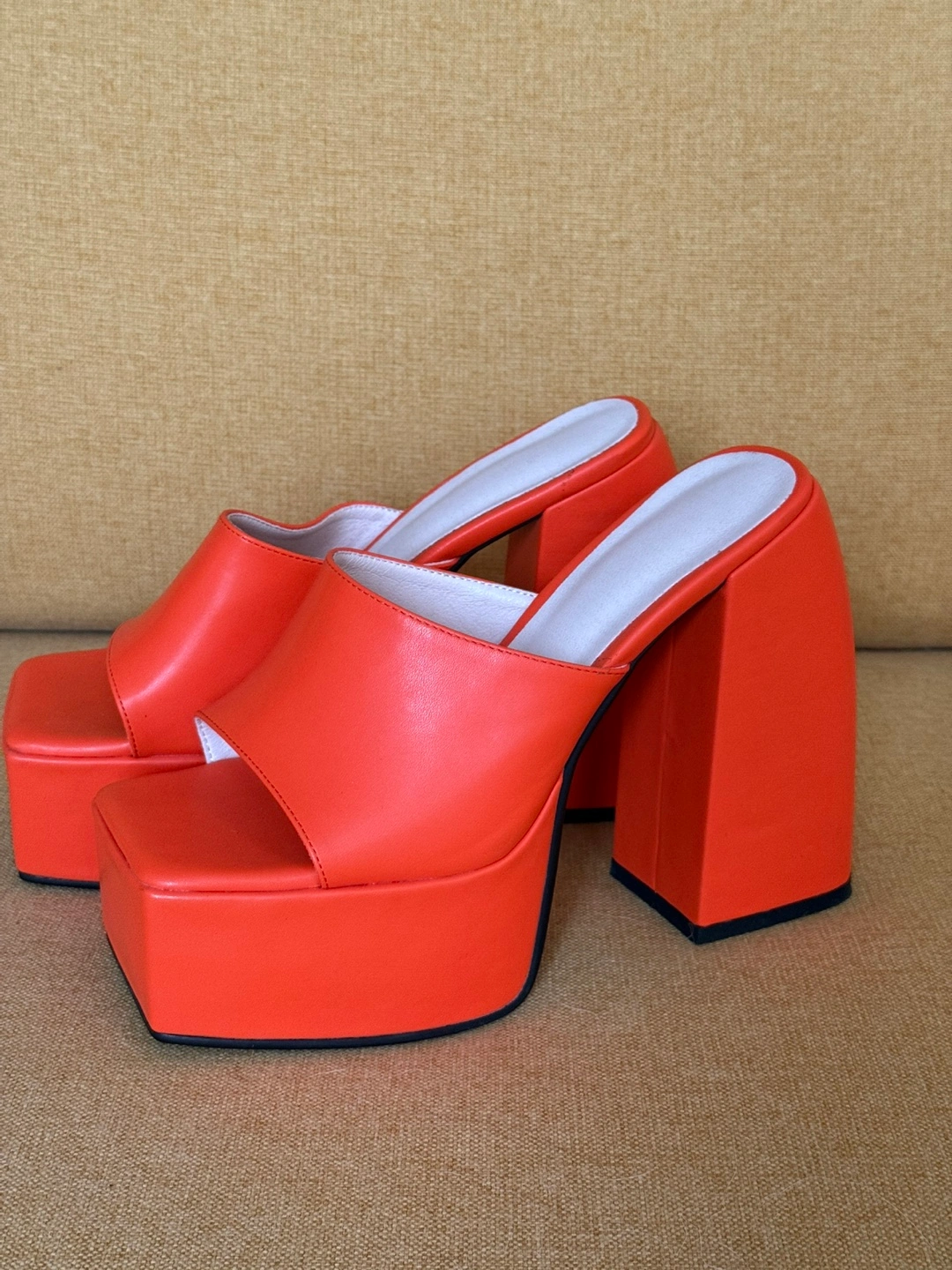 These bright orange platform mules are sure to make a statement! They're a size 7 and in great condition, perfect for adding a pop of colour to your wardrobe. There is a small scratch on the front of one of the shoes.