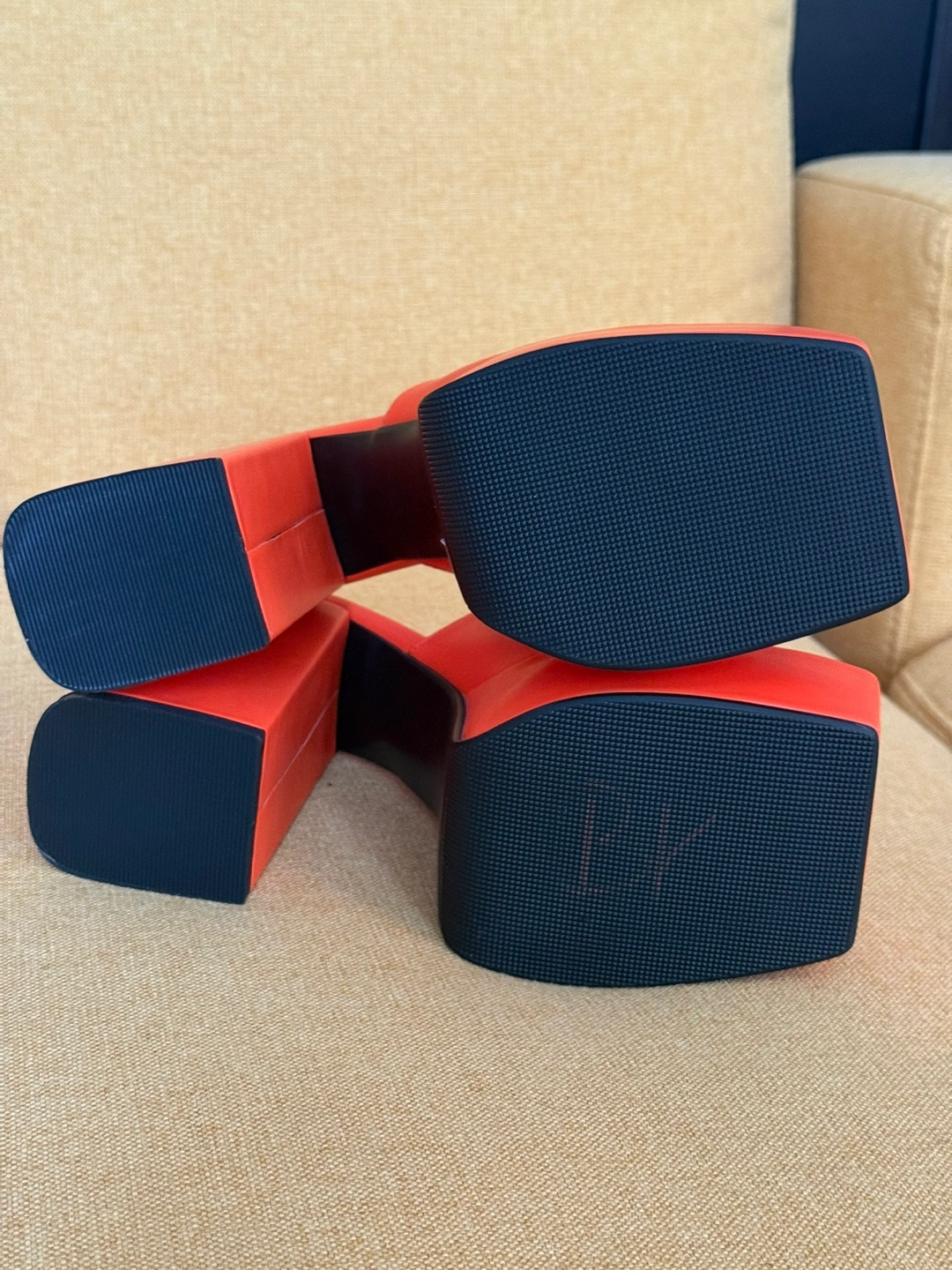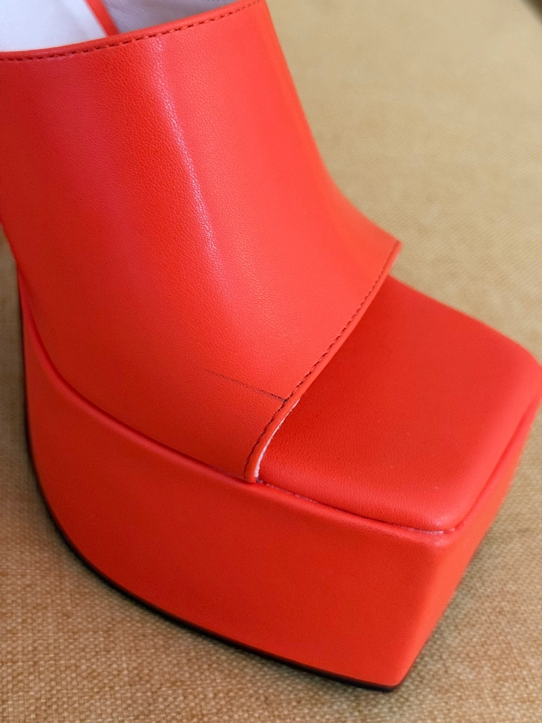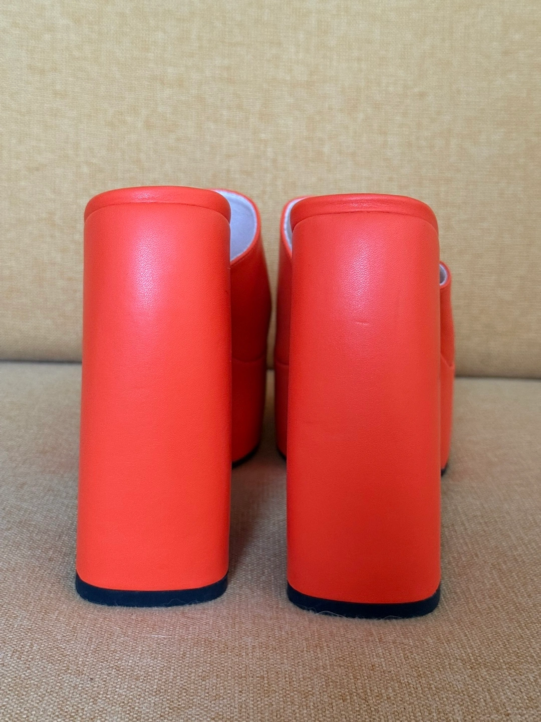 These bright orange platform mules are sure to make a statement! They're a size 7 and in great condition, perfect for adding a pop of colour to your wardrobe. There is a small scratch on the front of one of the shoes.