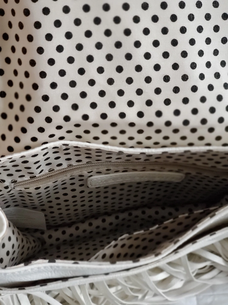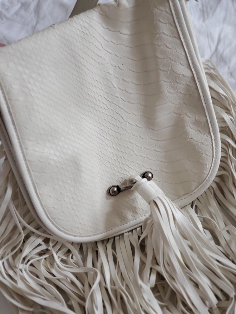 This Madden Girl crossbody bag is in great condition and ready for a new home! It features a stylish fringe detail and a unique snakeskin-like texture on the flap. The interior is lined with a fun black and white polka dot pattern. Perfect for adding a touch of boho chic to any outfit!