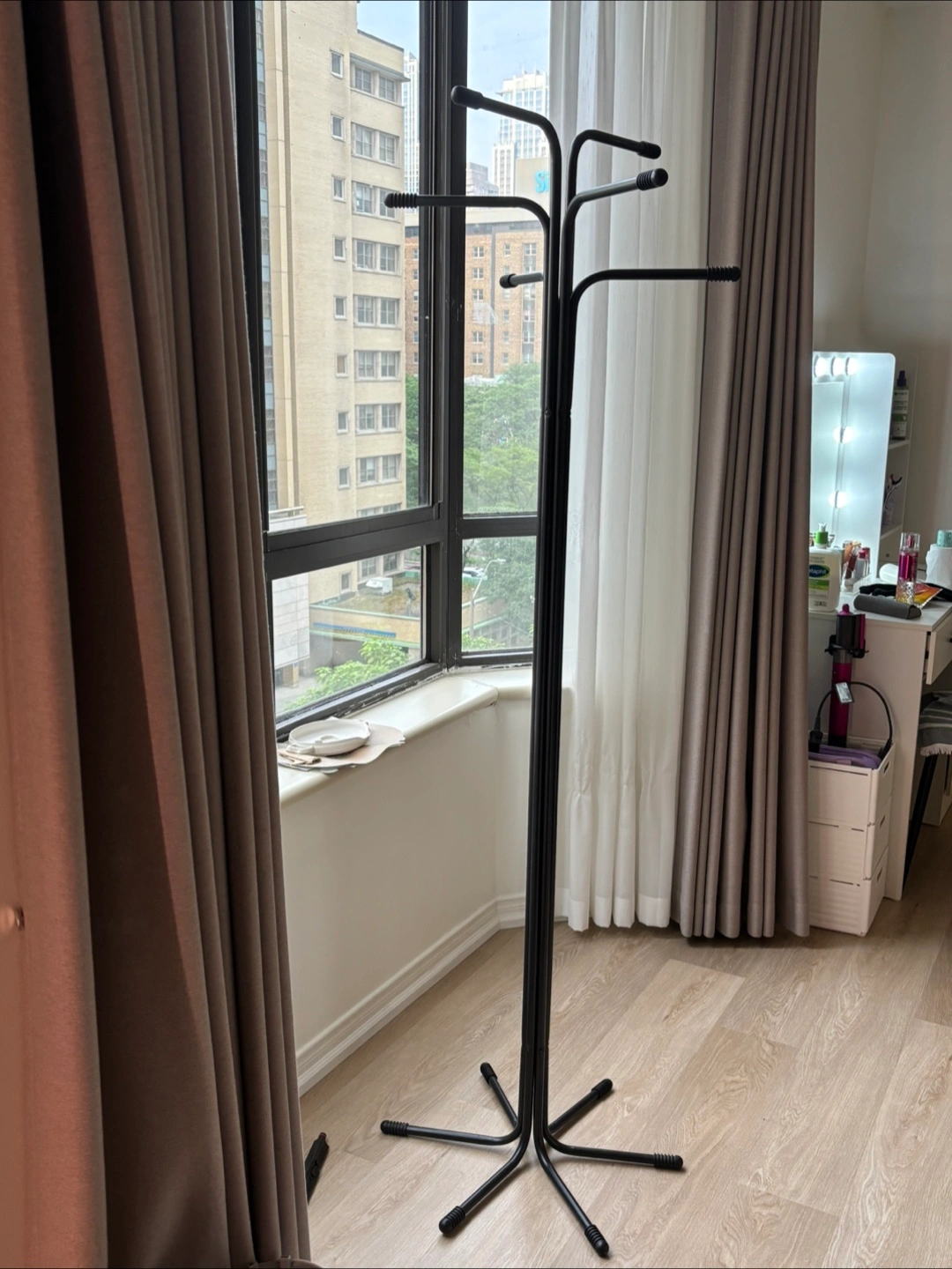 Selling a black metal coat rack. It's in great condition and ready to hold your coats and hats! It's a simple and functional design that fits well in any entryway or room