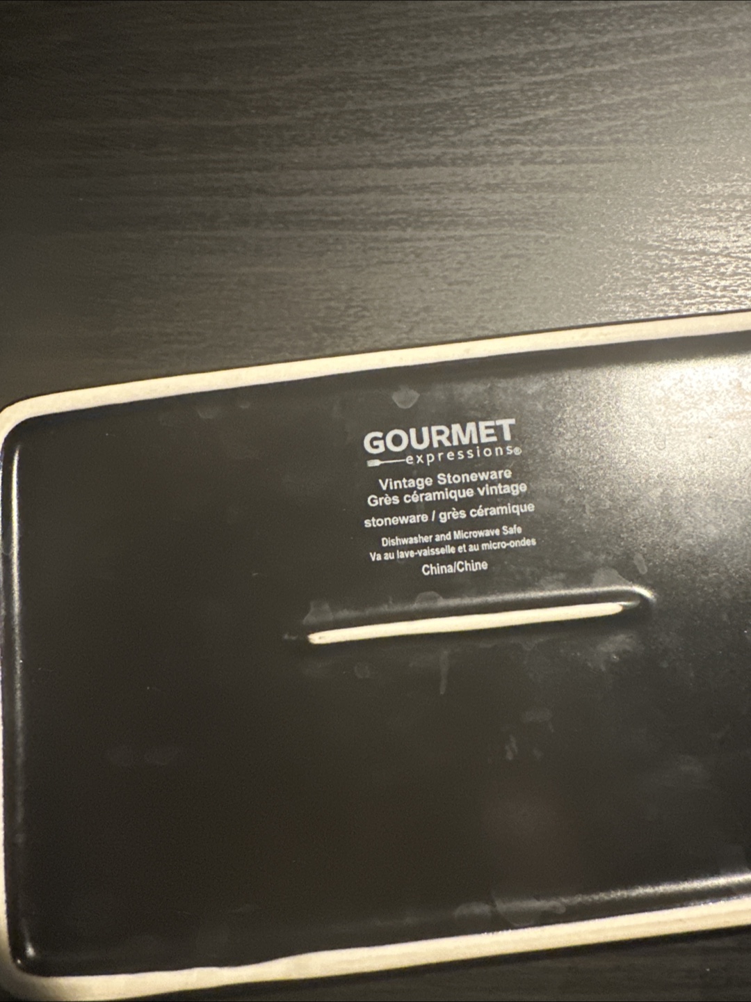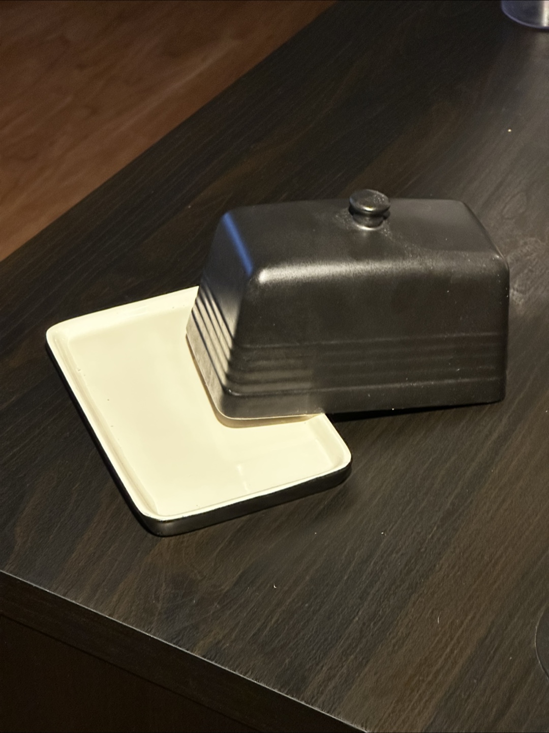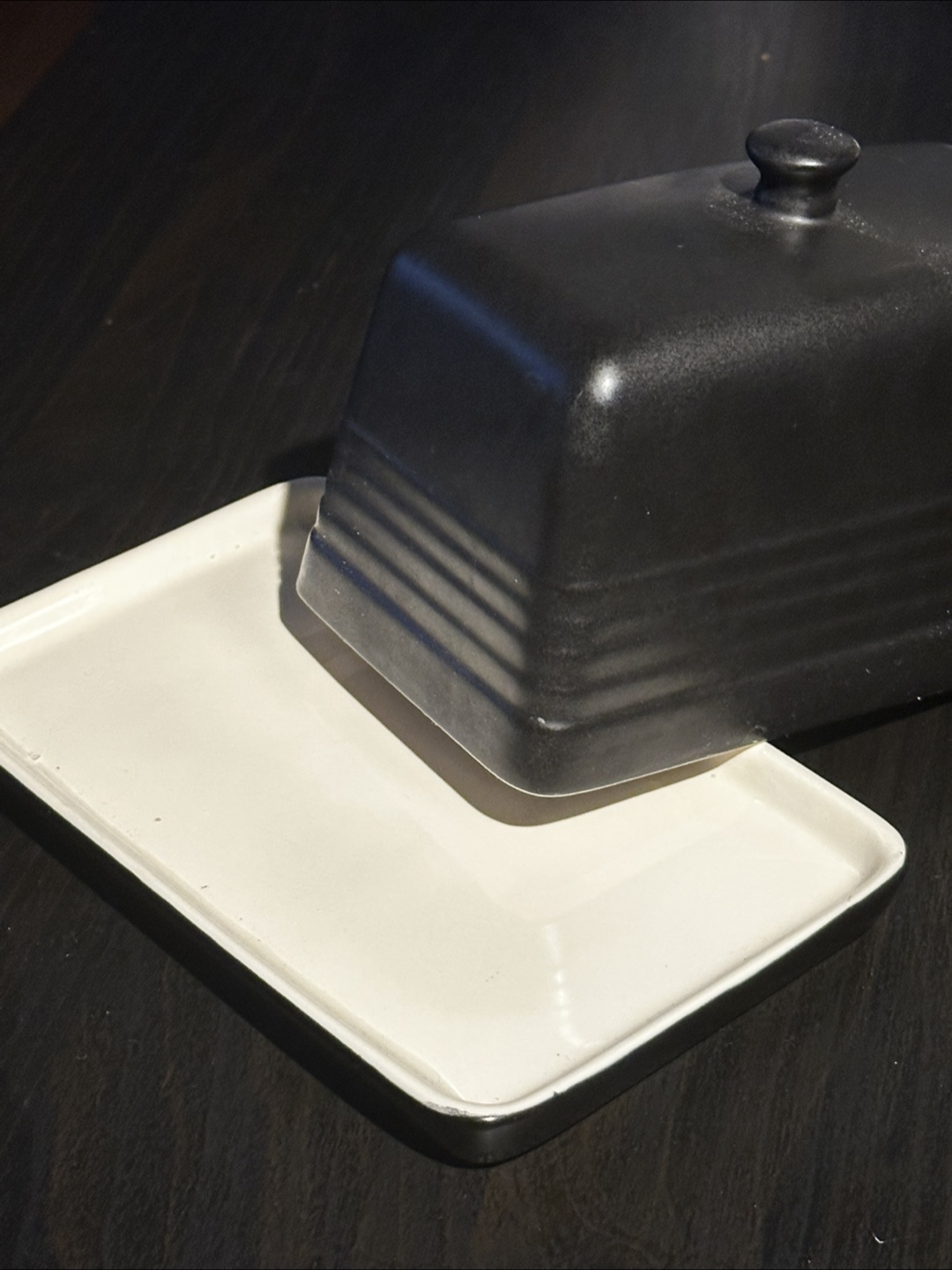 Here's a lovely butter dish from Gourmet Expressions! It's made of vintage stoneware and is dishwasher and microwave safe. The base is a cream colour and the lid is black.