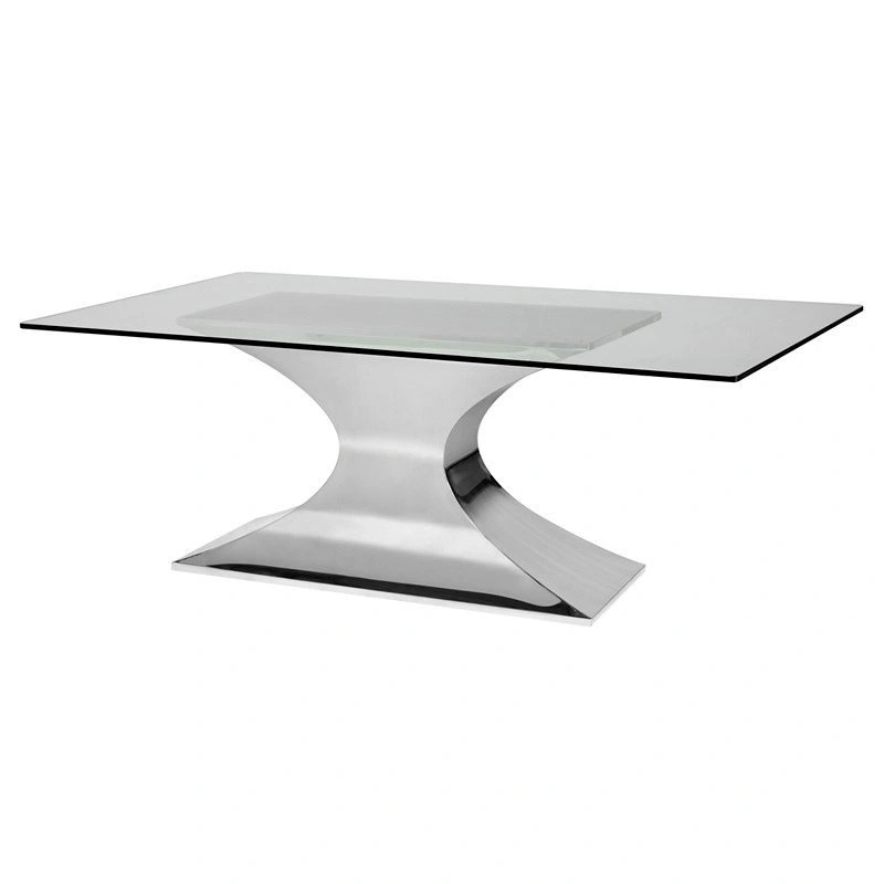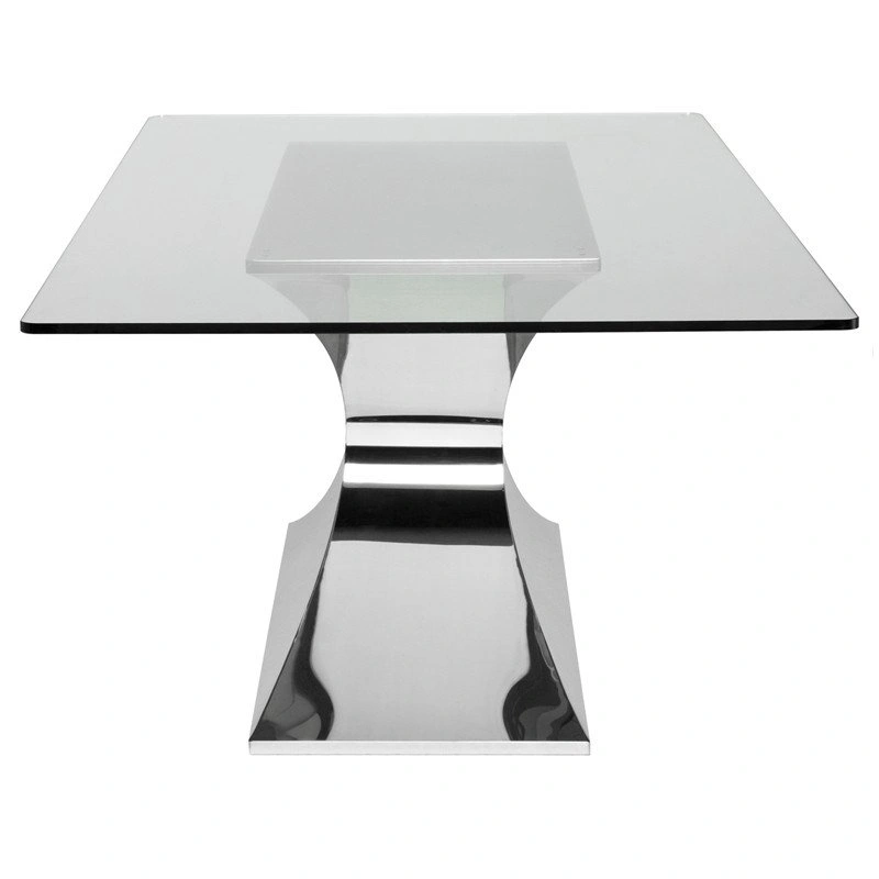 Featuring a tapered and curved pedestal base coupled with a tempered glass table top.