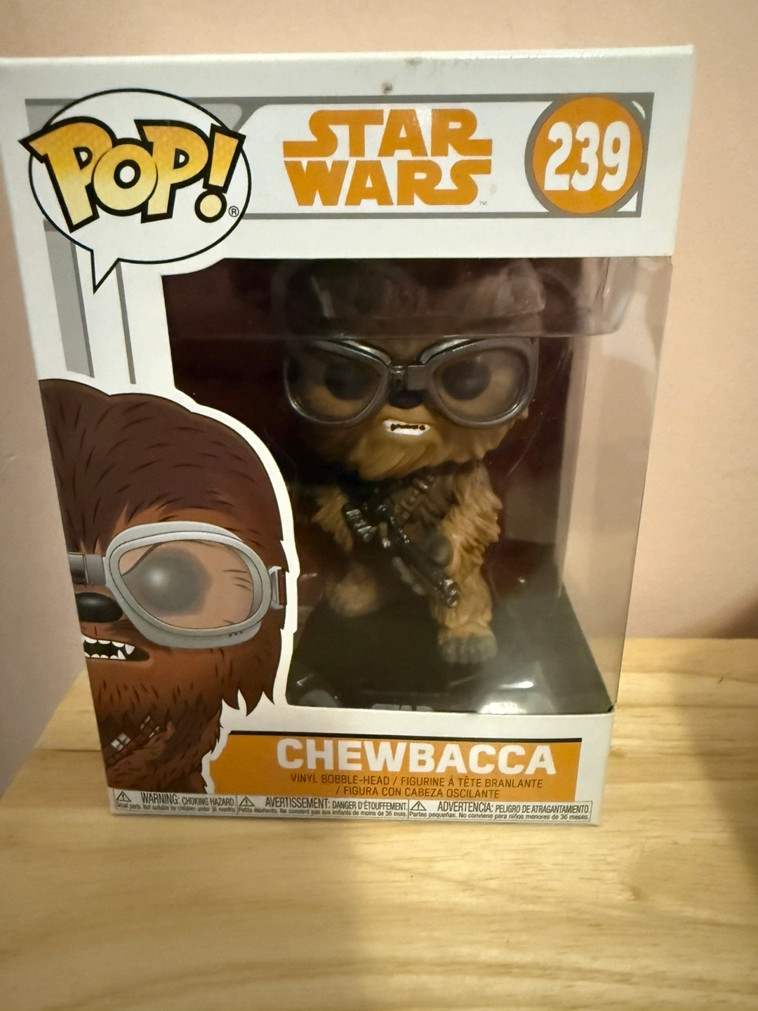 Selling a Funko Pop! Star Wars Chewbacca figure, number 239. It's a vinyl bobble-head figure. Please be aware of the choking hazard warning, as it's not suitable for children under 36 months