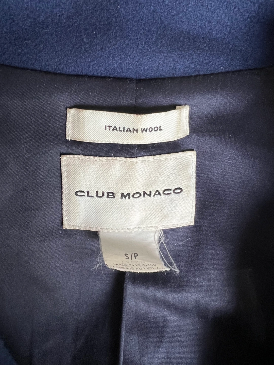 Stylish Club Monaco jacket in a navy blue colour, size S (women’s). It's made of Italian wool blend.