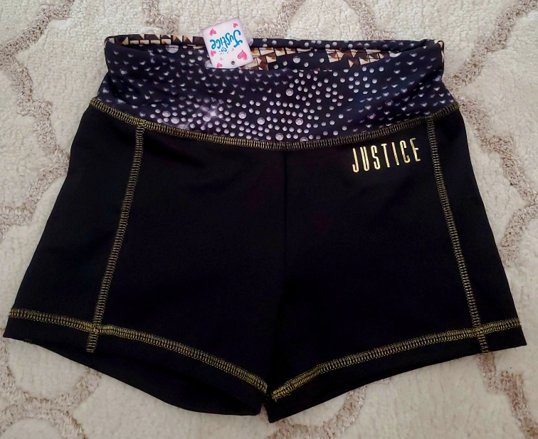 Brand new Justice athletic shorts, perfect for sports or everyday wear! These shorts are black with gold stitching and feature a unique patterned waistband.
