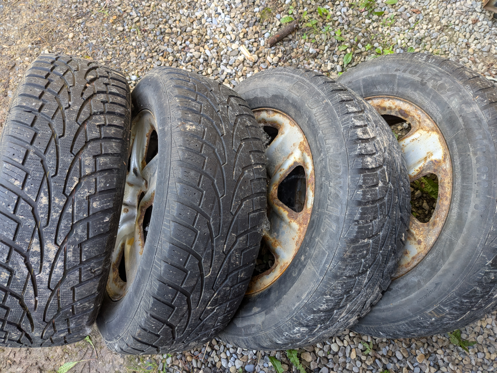 Tires probably have one season left on them, maybe two if you don't drive much. Winter rated. Rims are rusty but would still be great with a new coat of paint. They're OEM Toyota from a RAV4 but would also fit on CRVs and other vehicles with the same bolt pattern.