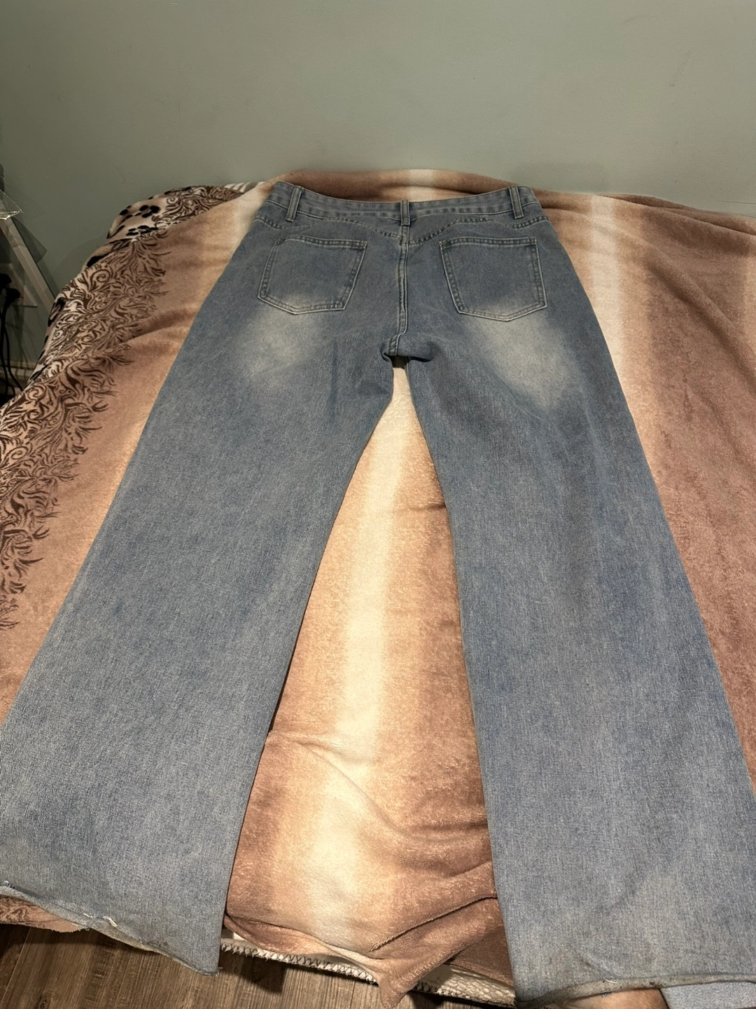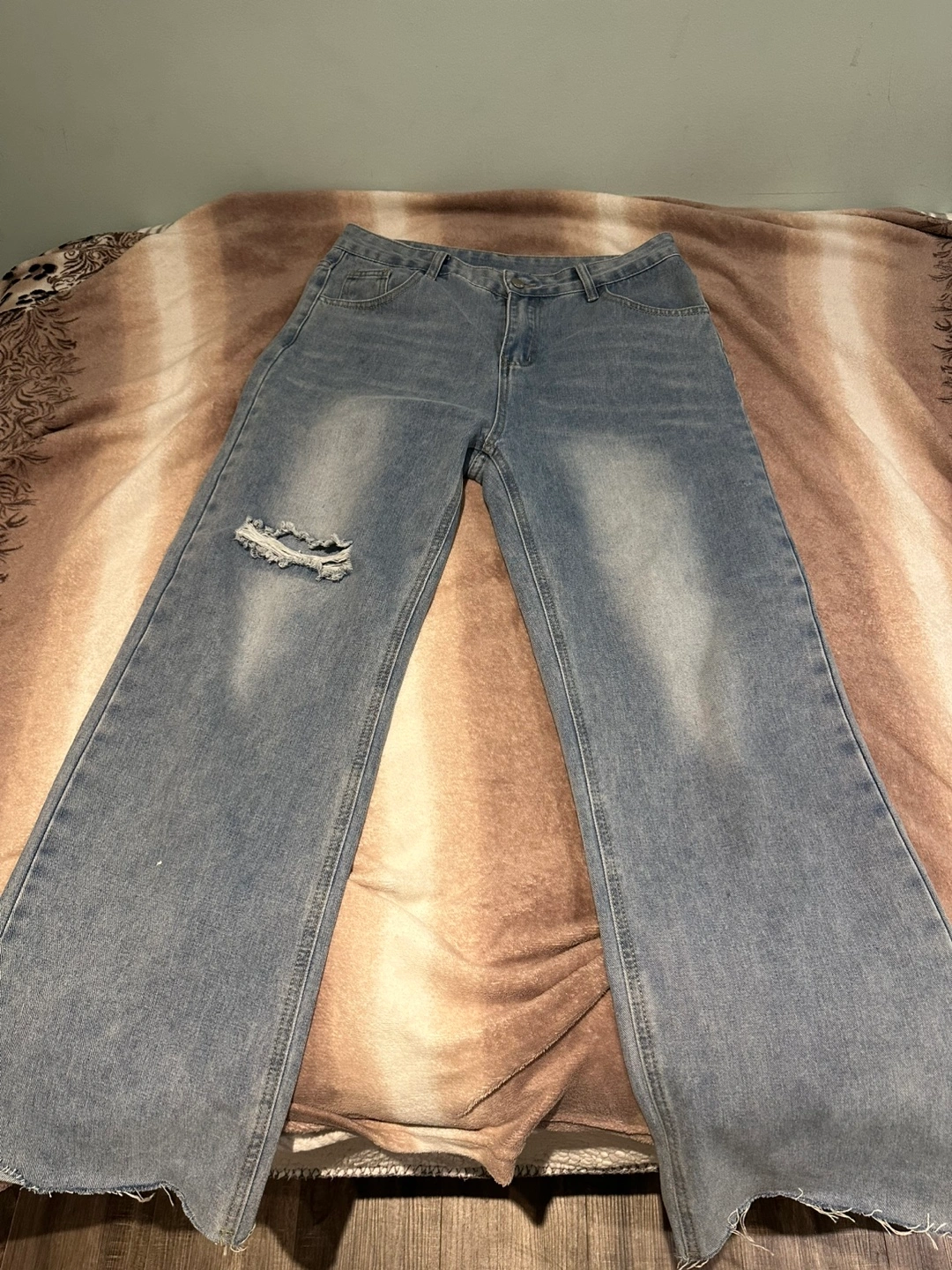 Selling a pair of ripped wide leg jeans. They are a light wash denim. The jeans have a distressed look with a rip on one knee. They're in good condition and ready for a new home!