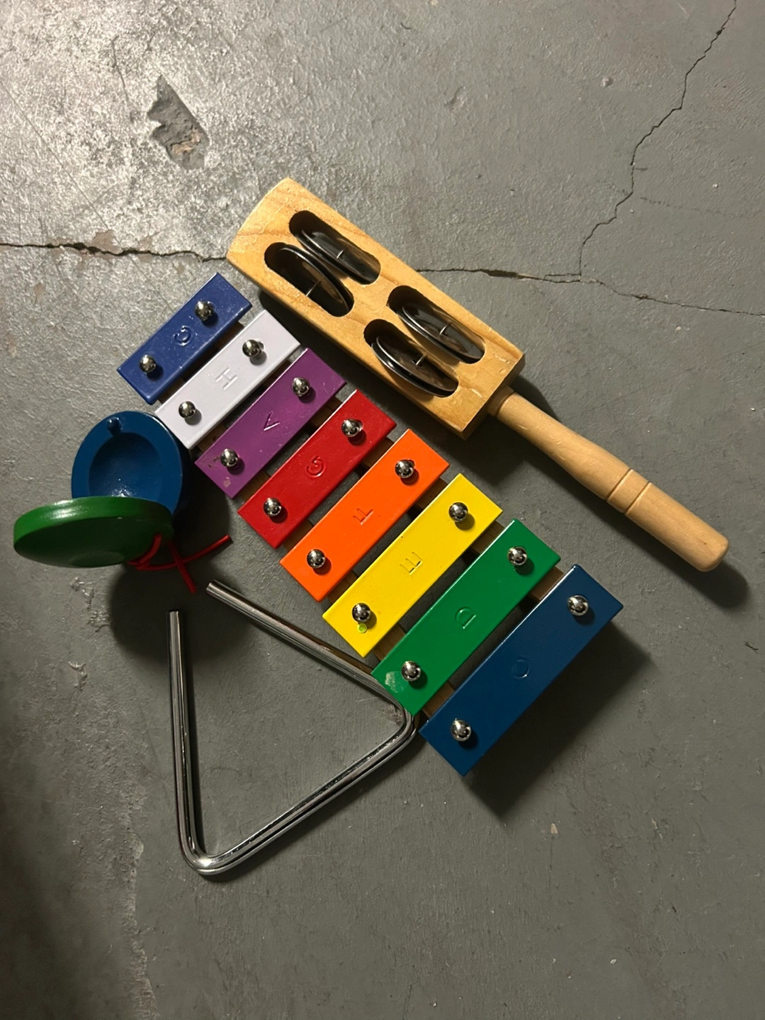 Here's a fun musical instrument set for kids! It includes a xylophone with rainbow-coloured keys, a tambourine, a triangle, and a small cymbal. Perfect for introducing little ones to the joy of music and rhythm