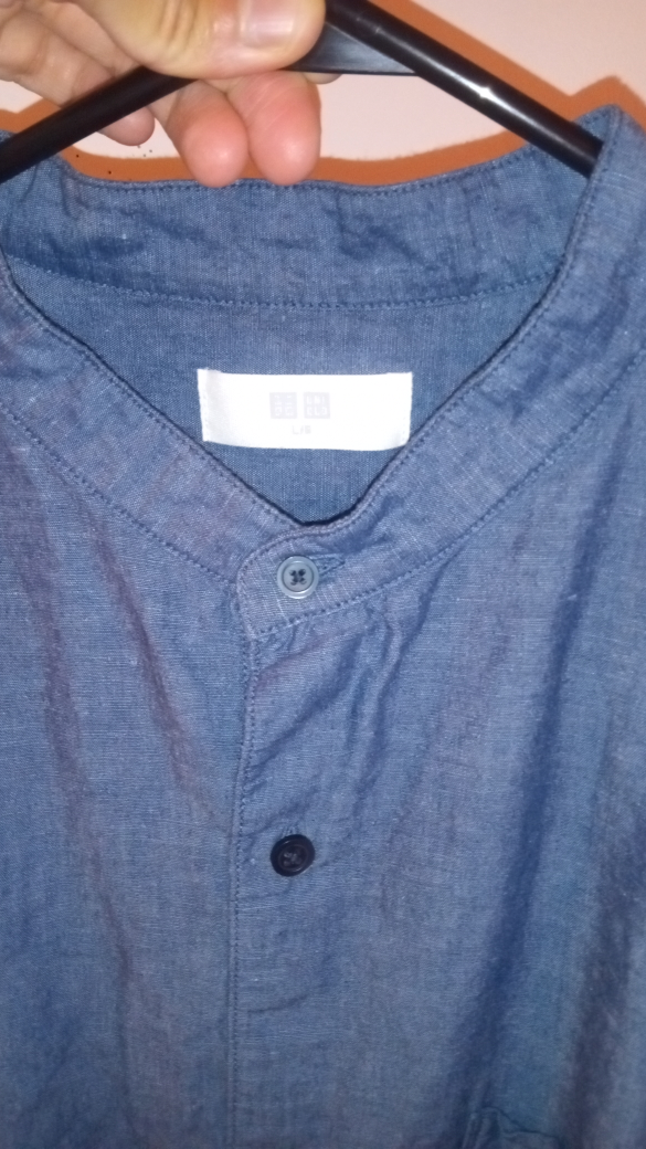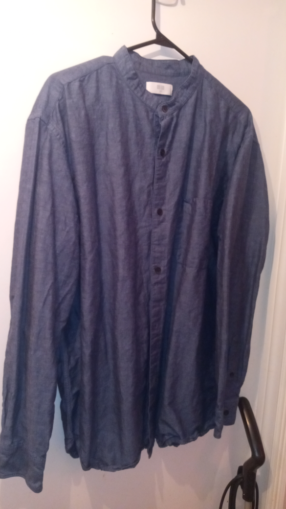 I'm selling a Uniqlo button-up shirt in a nice shade of blue! It's a size L and in good condition. Perfect for a casual look or dressing up a bit. It has a unique collar style. Feel free to message me if you're interested!