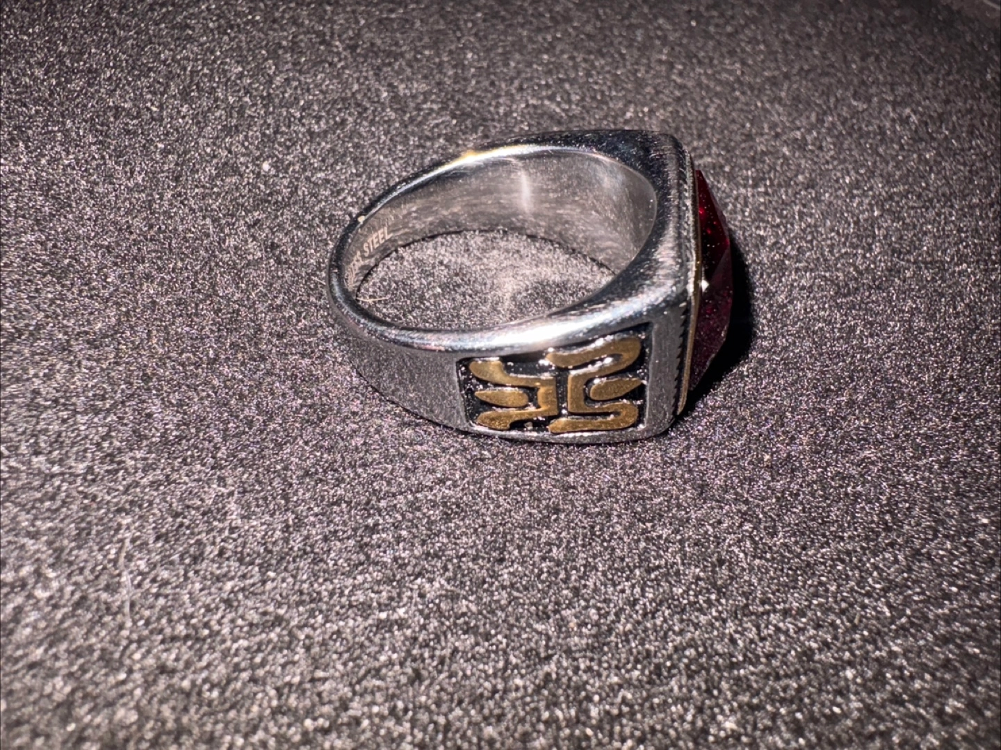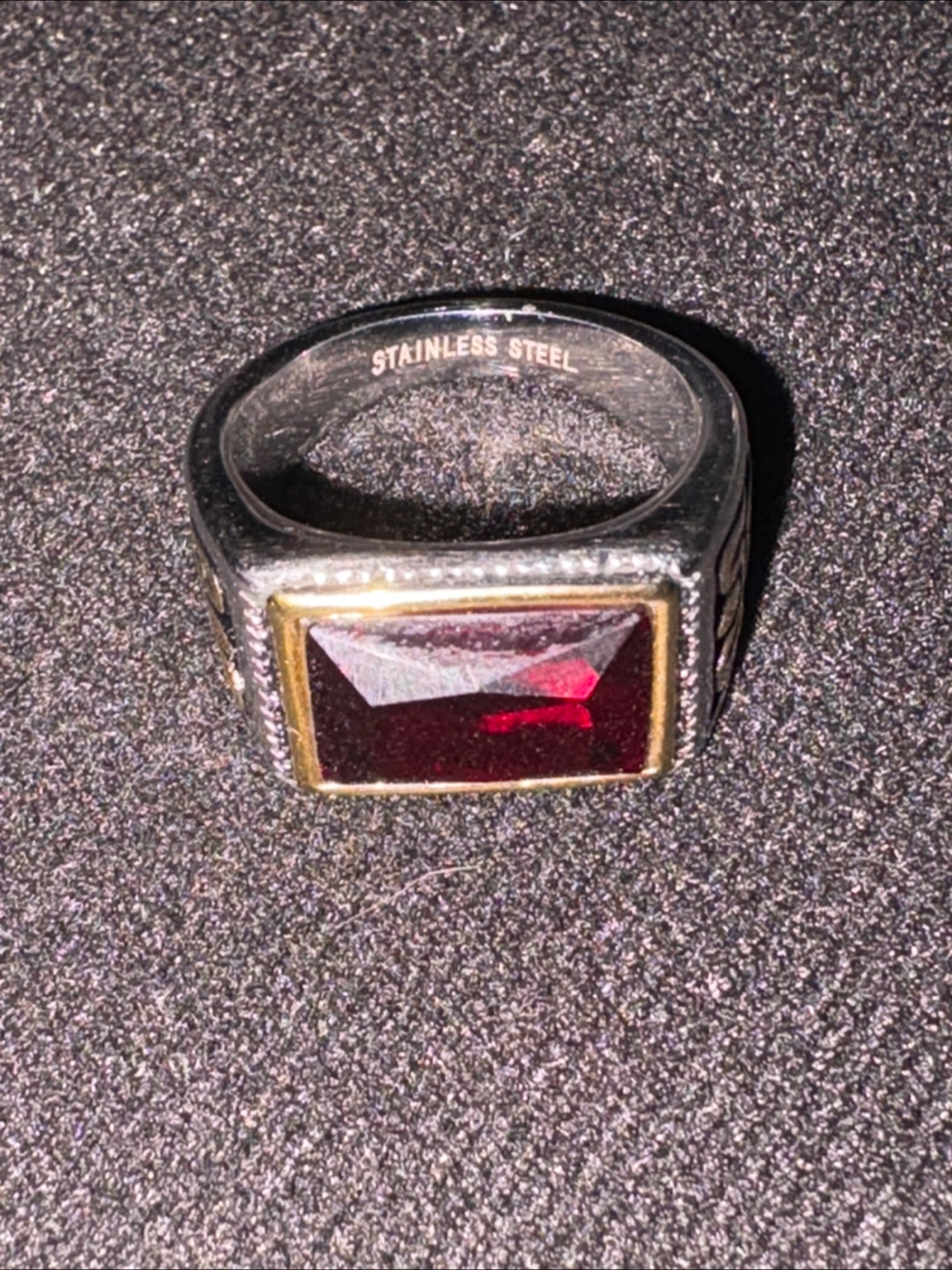 Selling a stainless steel ring featuring a striking red stone. The ring has a unique design with gold-coloured accents. It's in great condition and ready for a new home!
