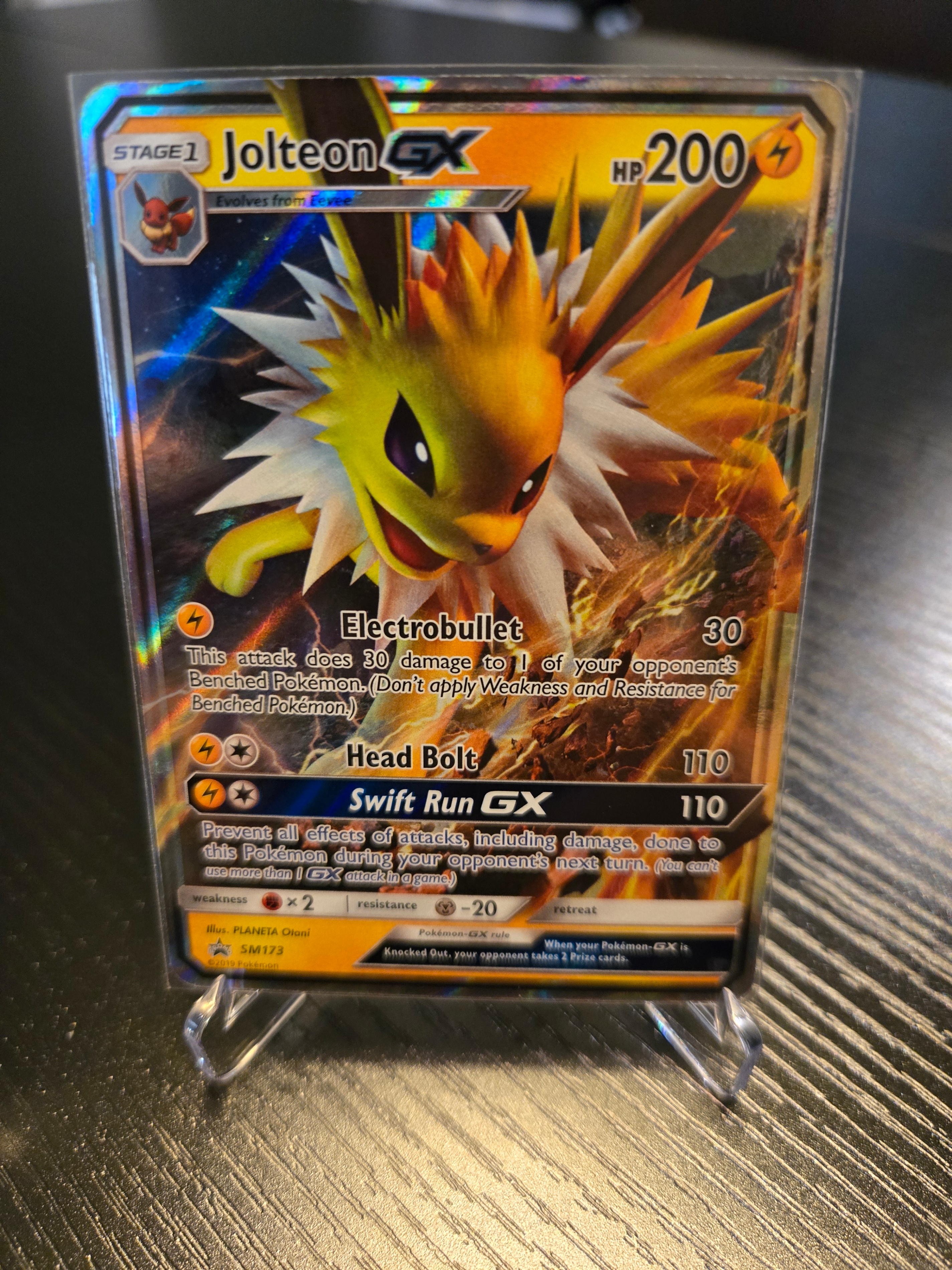 Lightning-fast Jolteon-GX promo from the Sun & Moon era (SM173). Near-Mint—clean surface, strong holo, sleeved since pulled. Great Eeveelution binder card.